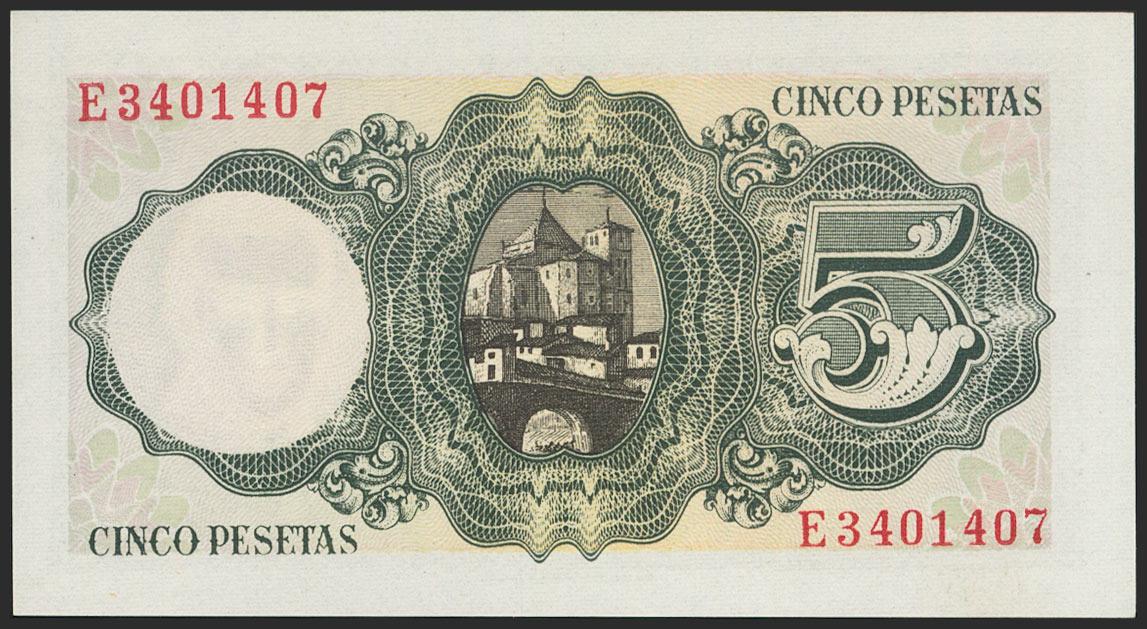 5 Pesetas. August 16, 1951. Series E. (Edifil 2021: 459a). Original sizing. Uncirculated.
