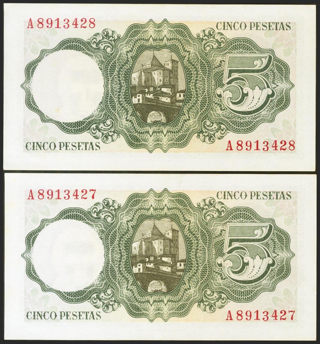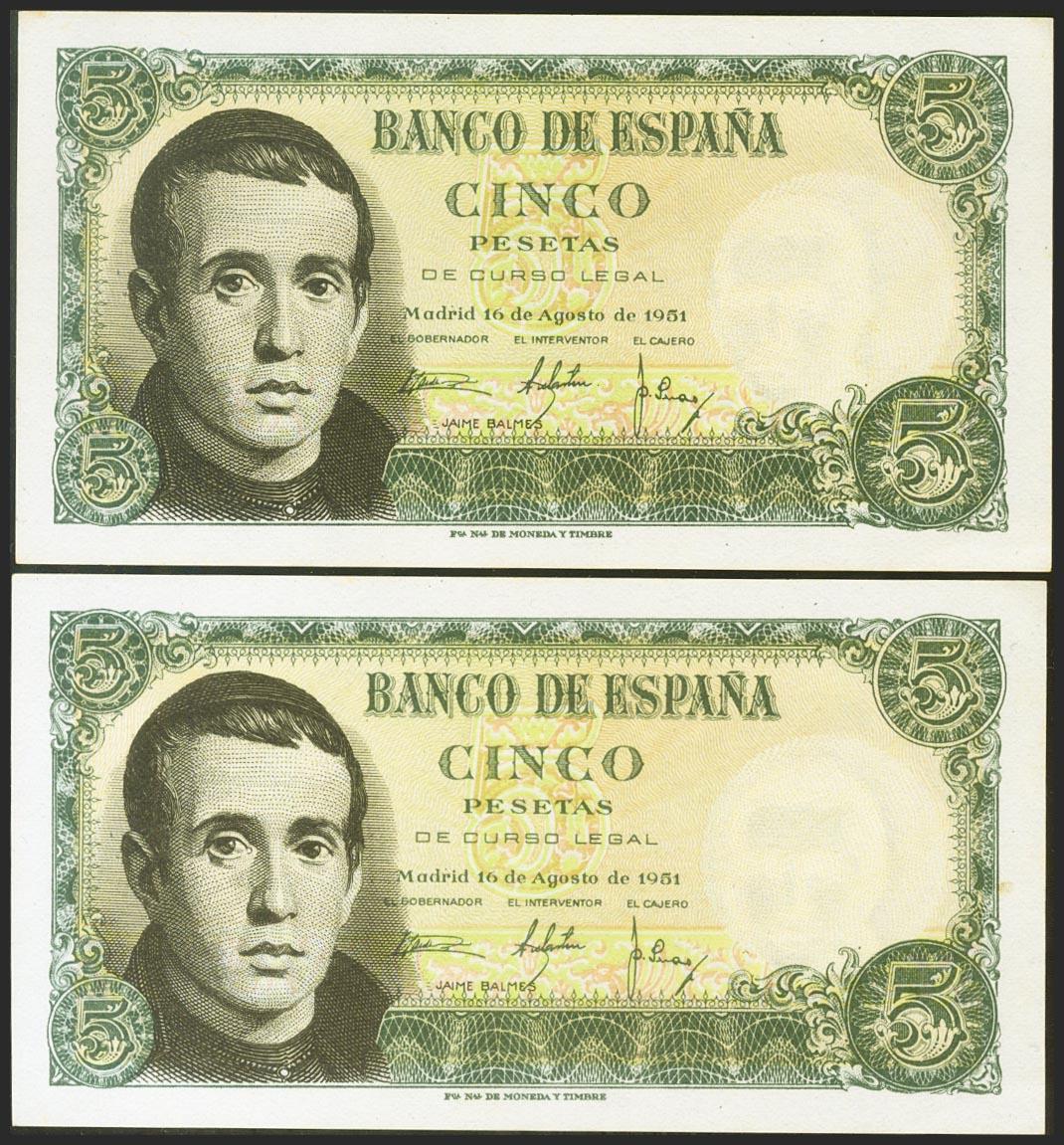 5 Pesetas. August 16, 1951. Correlative couple. Series A. (Edifil 2021: 459a). Original sizing. Almost Uncirculated.
