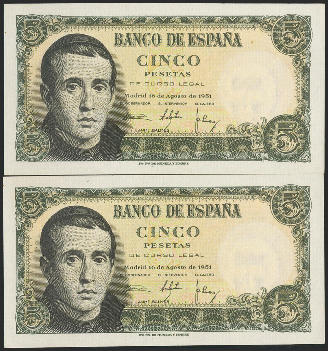 English 5 Pesetas. August 16, 1951. Correlative couple. Series 1L. (Edifil 2021: 459a). Original sizing. Uncirculated.