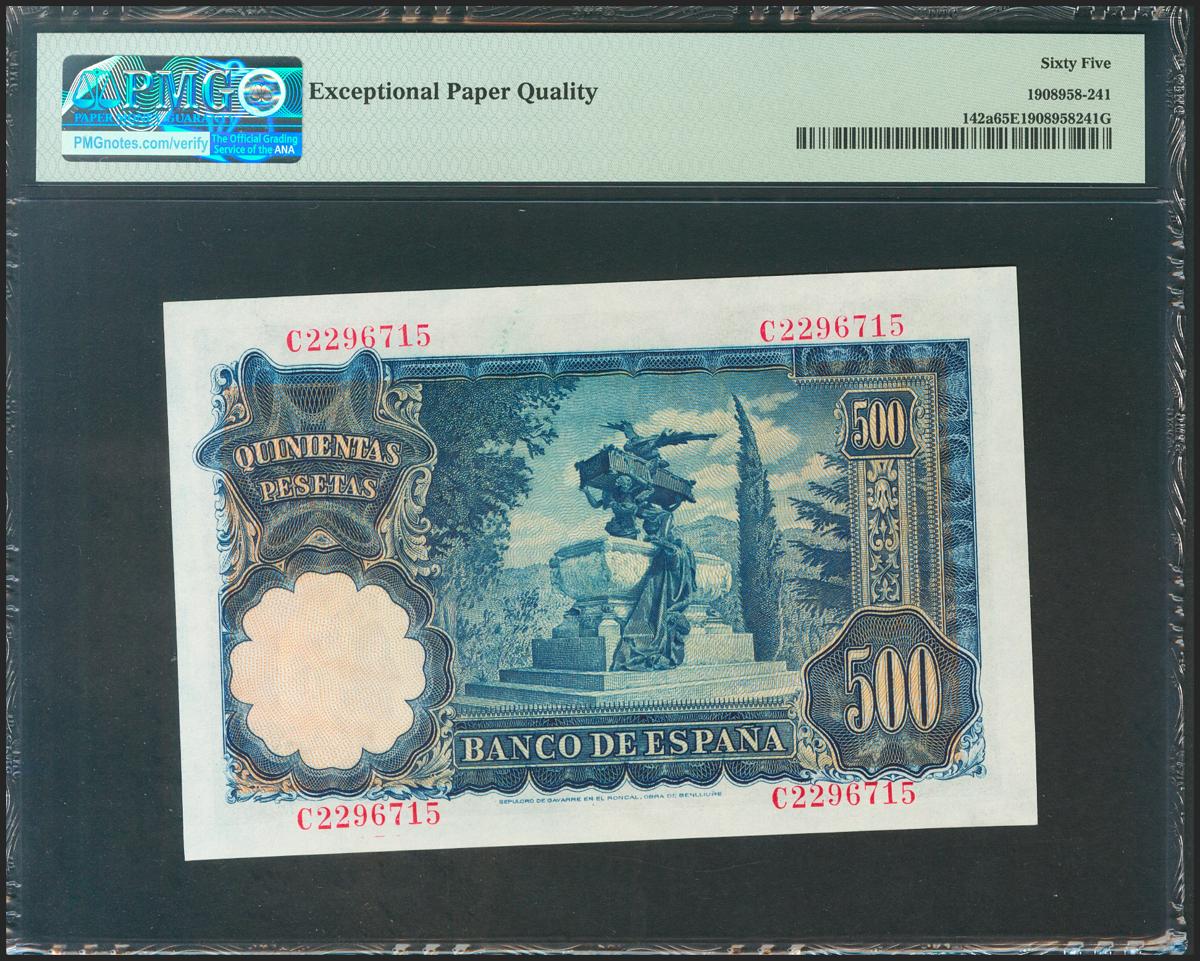 500 pesetas. November 15, 1951. Series C, last series issued. (Edifil 2021: 460a, Pick: 142a). Rare in this quality, original sizing. Uncirculated. PMG65EPQ package.