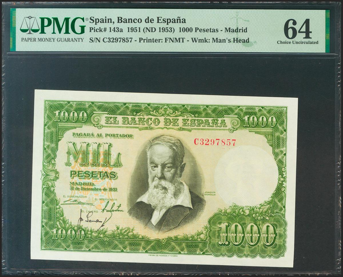 English 1000 Pesetas. December 31, 1951. Series C, last series issued. (Edifil 2021: 463a, Pick: 143a). Unusual in this quality. Uncirculated. PMG64 package.