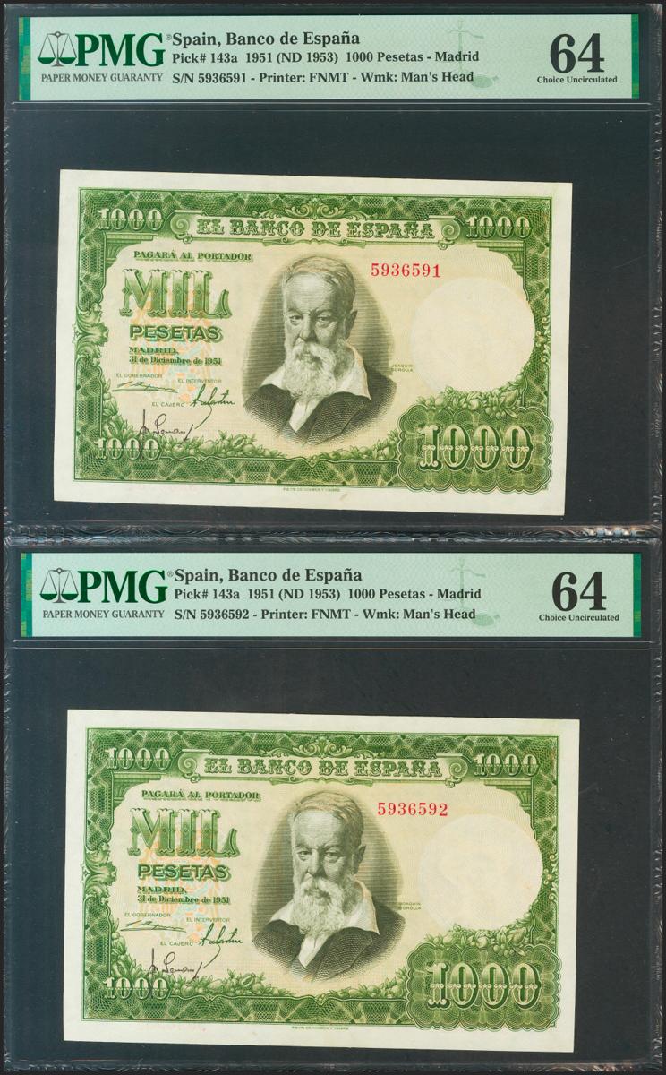 1000 Pesetas. December 31, 1951. Correlative couple. No serie. (Edifil 2021: 463, Pick: 143a). Unusual in this quality. PMG64 package, both.
