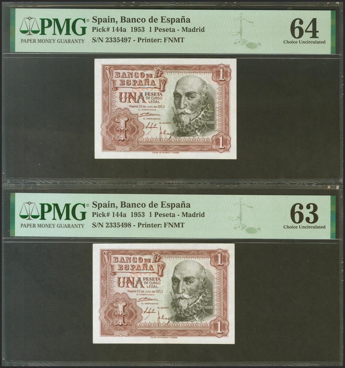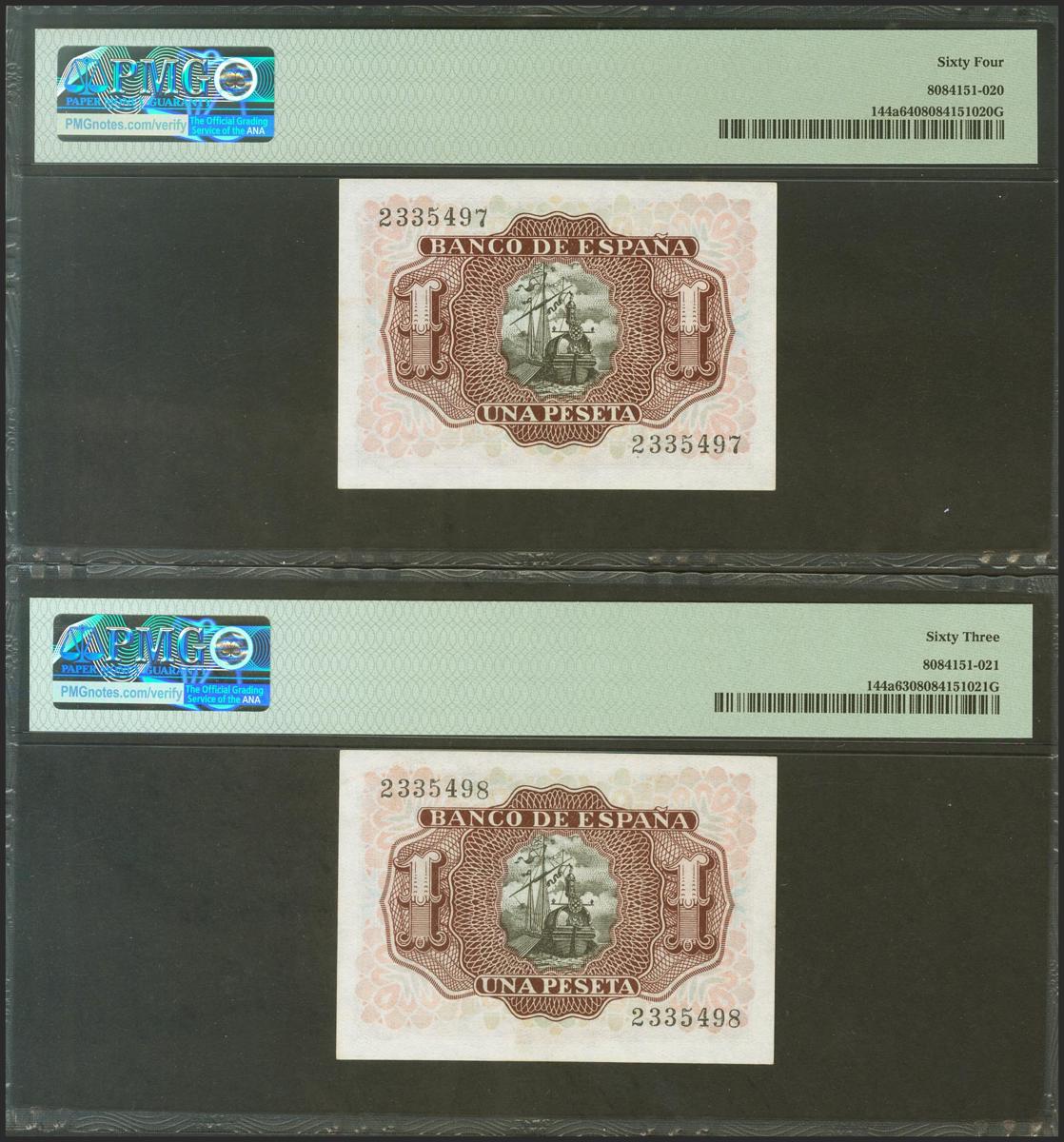 1 peseta. July 22, 1953. Correlative couple. No serie. (Edifil 2021: 465, Pick: 144a). Uncirculated. Encapsulated PMG63 / 64.