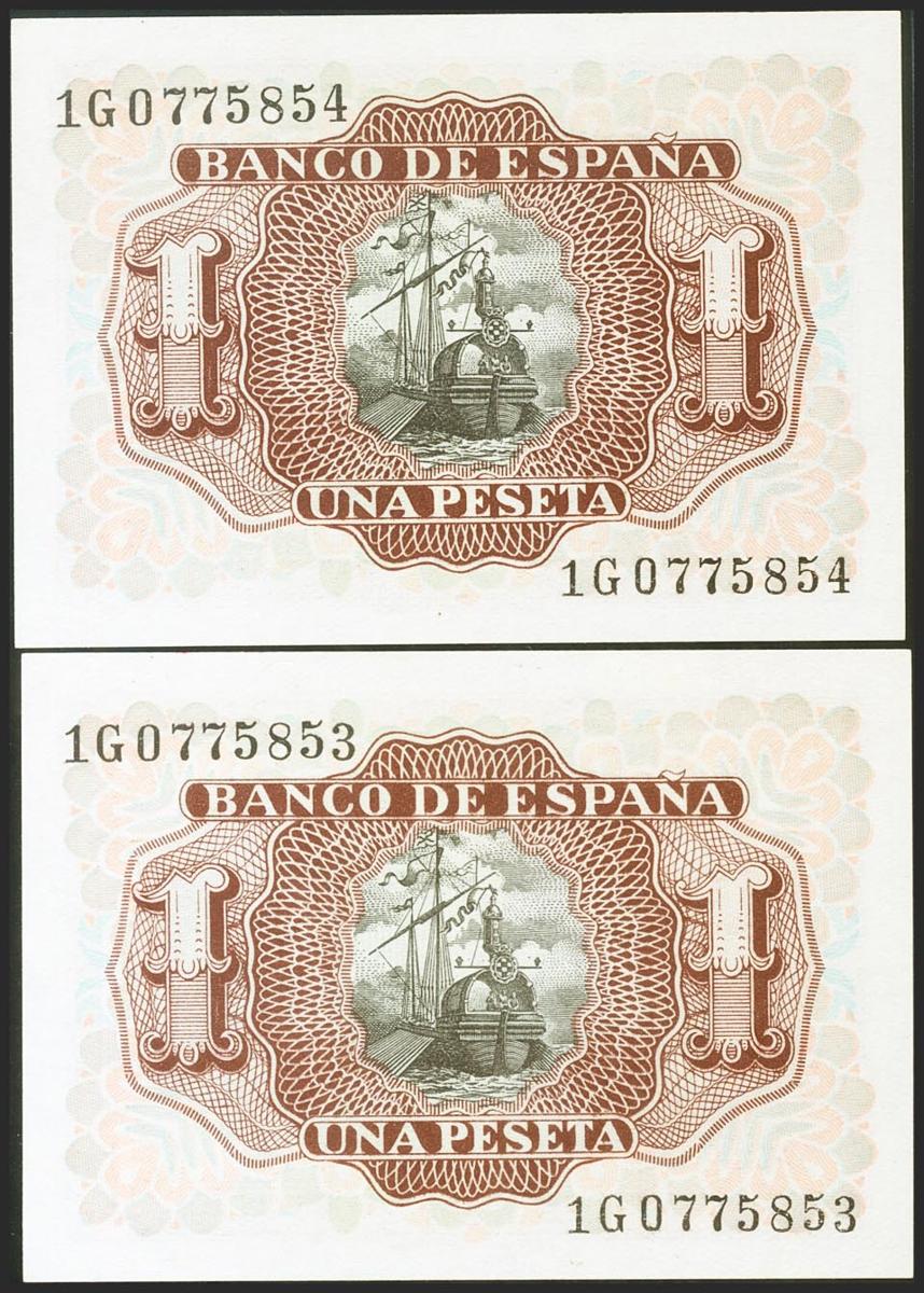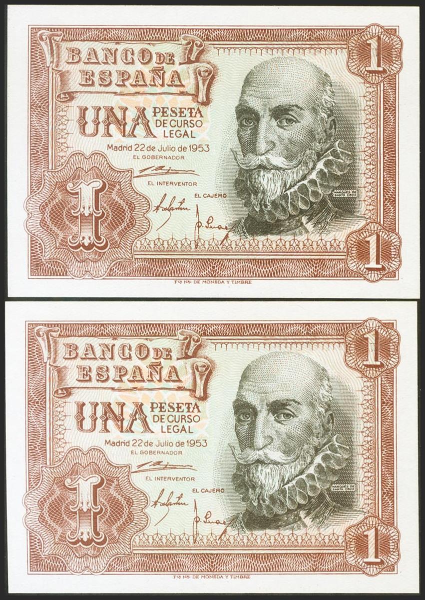 1 peseta. July 22, 1953. Correlative couple. 1G series. (Edifil 2021: 465a). Original sizing. Uncirculated.