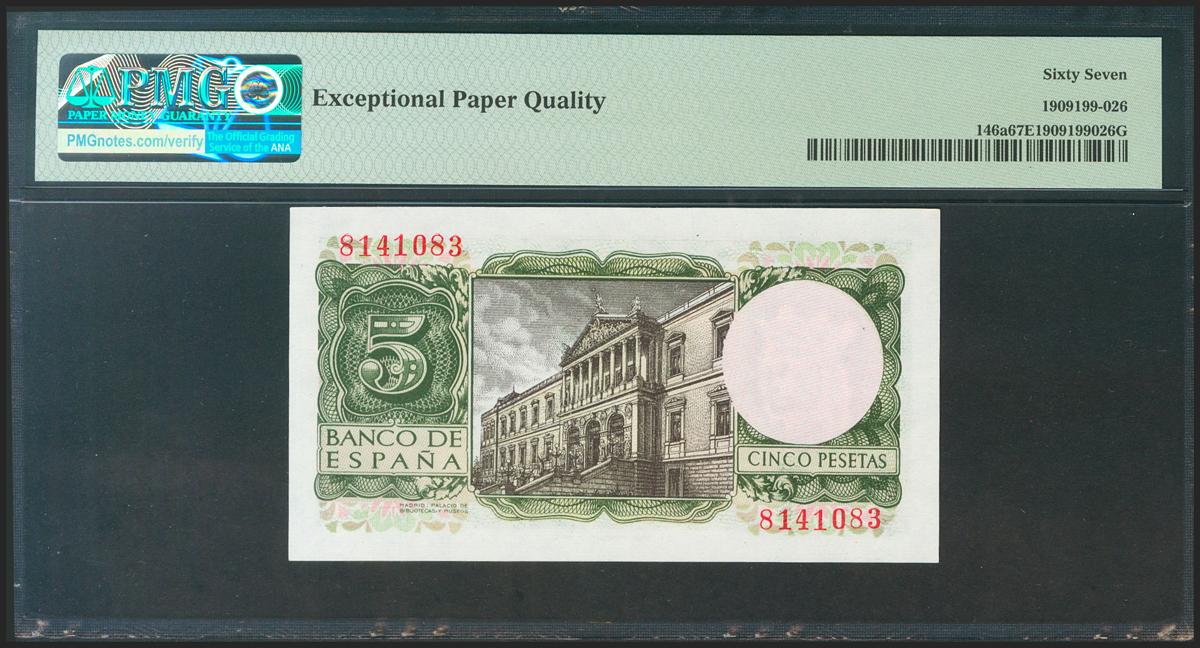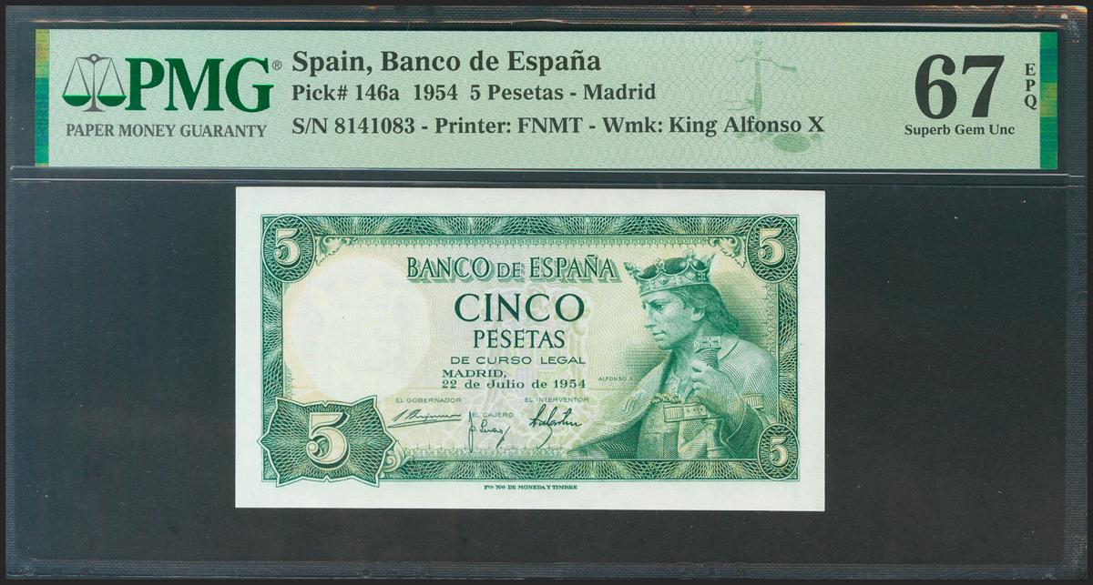 5 Pesetas. July 22, 1954. Without series. (Edifil 2021: 466, Pick: 146a). Rare in this quality, original sizing. Uncirculated. Package PMG67EPQ.