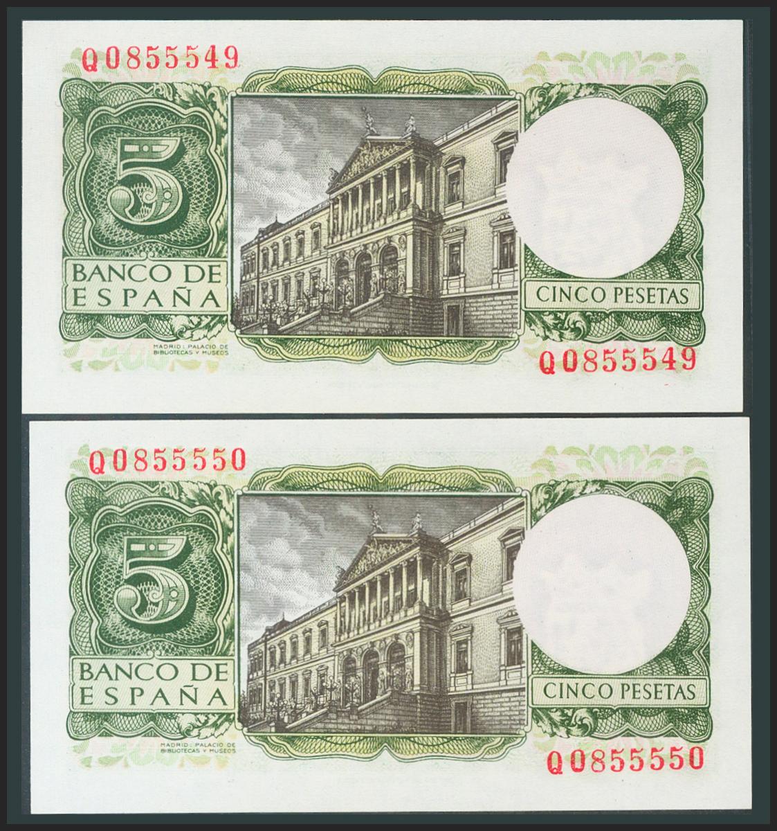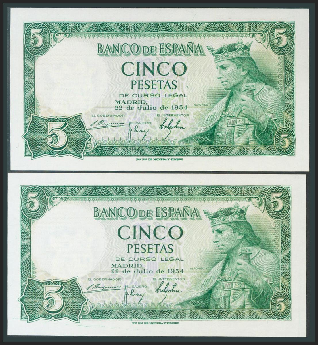 5 Pesetas. July 22, 1954. Correlative couple. Series Q. (Edifil 2021: 466a). It keeps all its original size. Uncirculated.