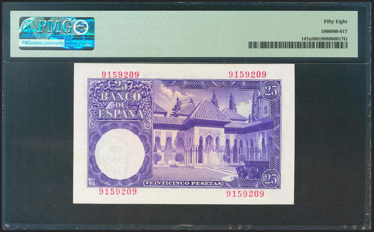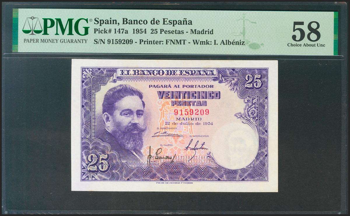 English 25 pesetas. July 22, 1953. Without series. (Edifil 2021: 467, Pick: 147a). EBC ++. PMG58 package.