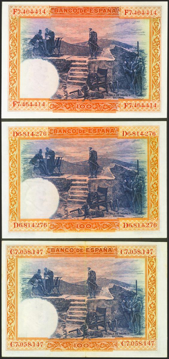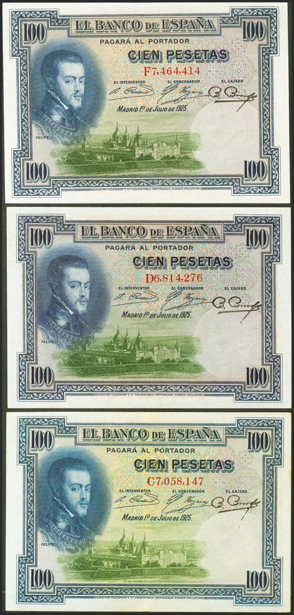 English Set of 3 100 Pesetas banknotes issued on July 1, 1925 with series C, D and F, respectively. (Edifil 2021: 353). They retain a large part of the original size. Extremely Fine/ Uncirculated.