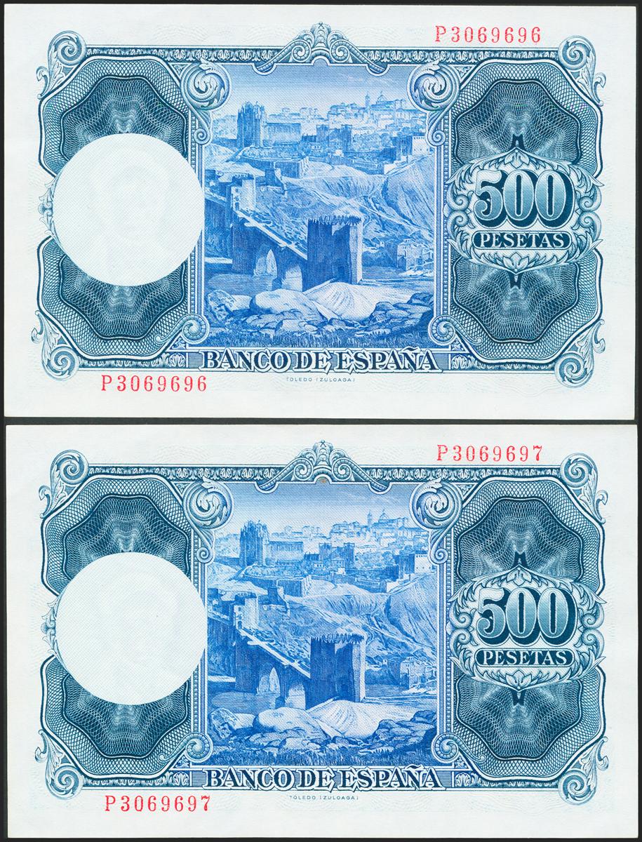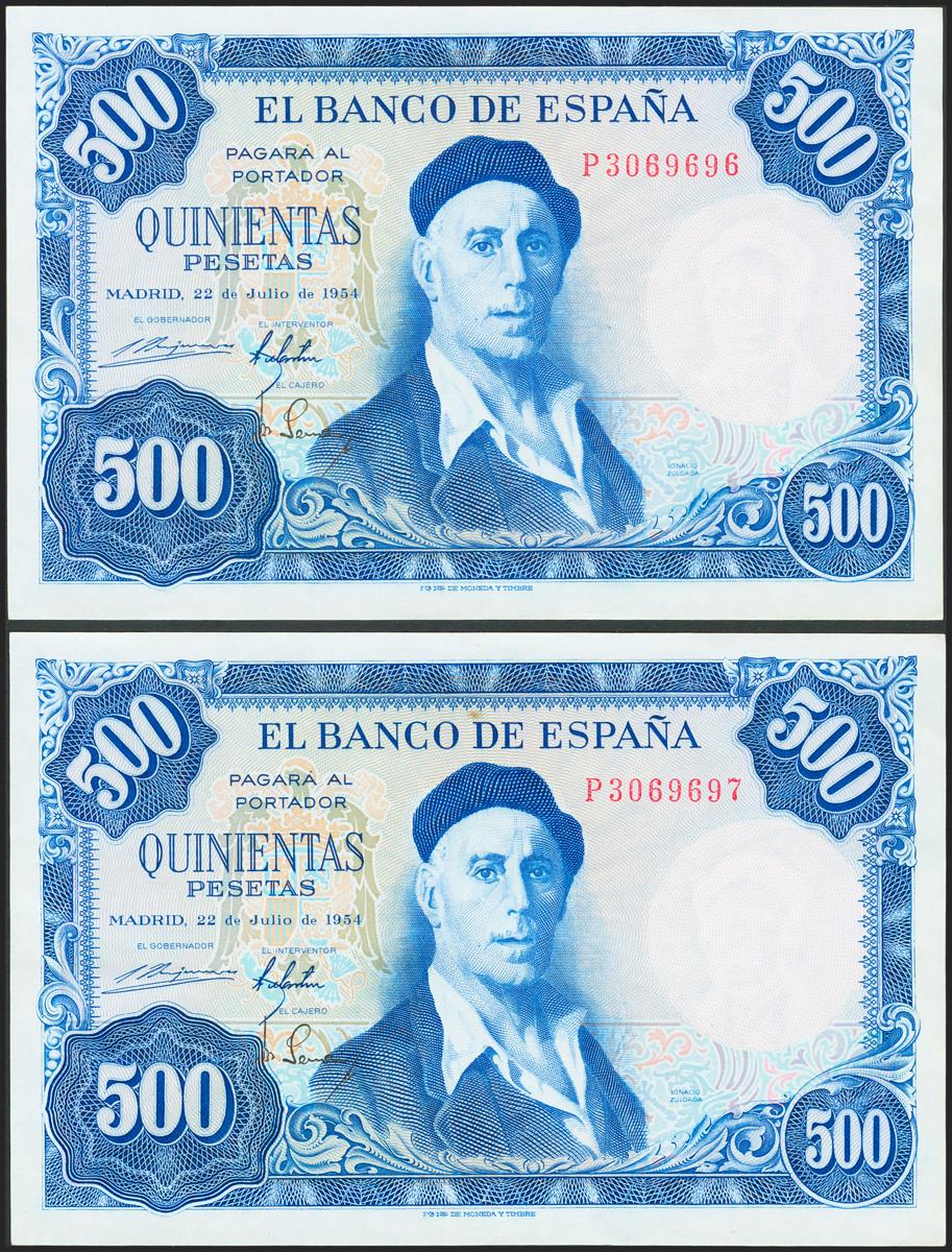 500 pesetas. July 22, 1954. Correlative couple. Series P. (Edifil 2021: 468b). It keeps all its original size. Almost Uncirculated.