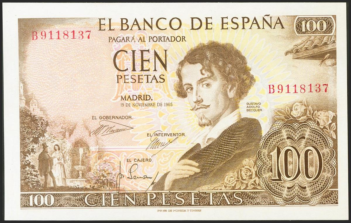 100 pesetas. November 19, 1965. Series B. (Edifil 2021: 470a). Original sizing. Uncirculated.