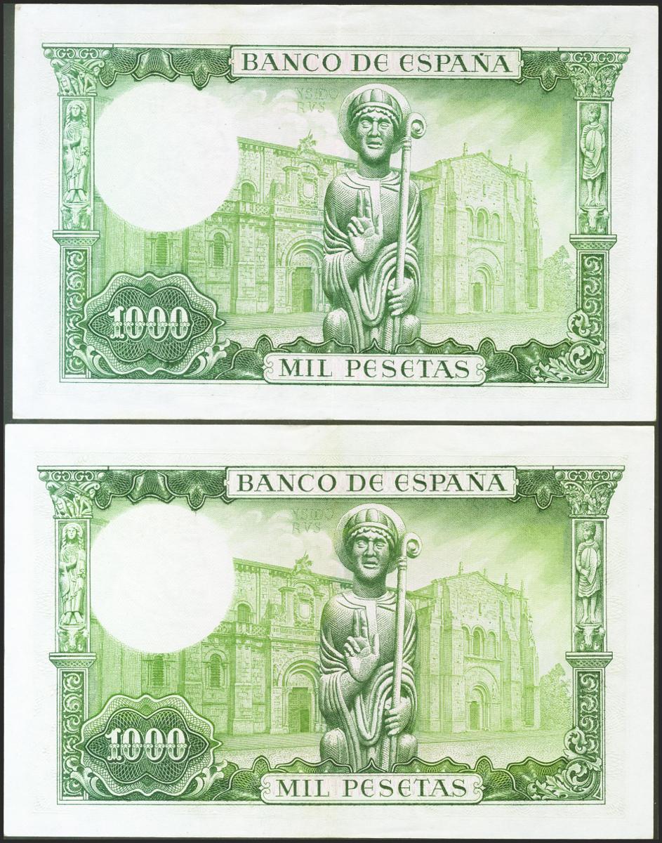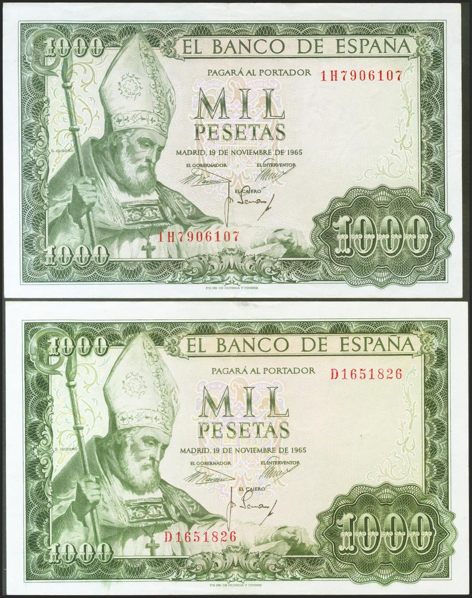 Set of 2 banknotes of 1000 Pesetas, issued on November 19, 1965, with series D and 1H, respectively. (Edifil 2021: 471b). They retain a large part of the original size. Extremely Fine.