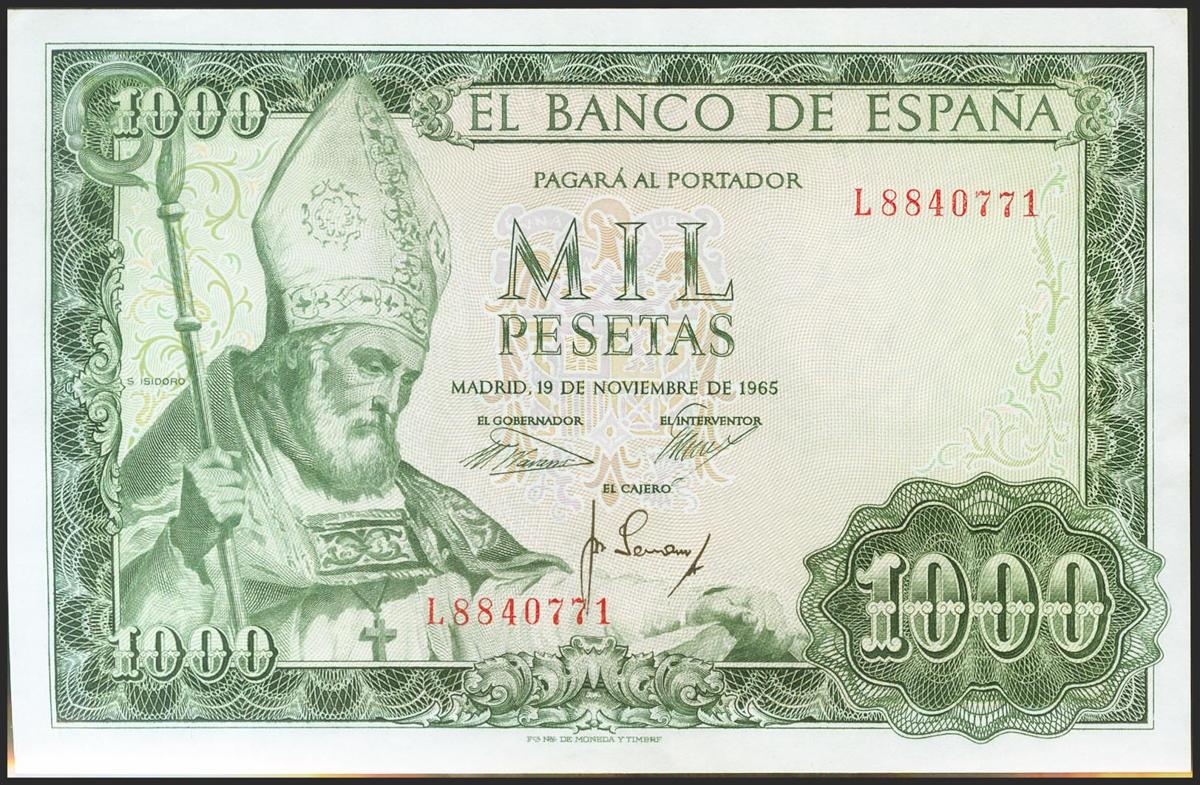 1000 Pesetas. November 19, 1965. Series L. (Edifil 2021: 471b). Original sizing. Almost Uncirculated.