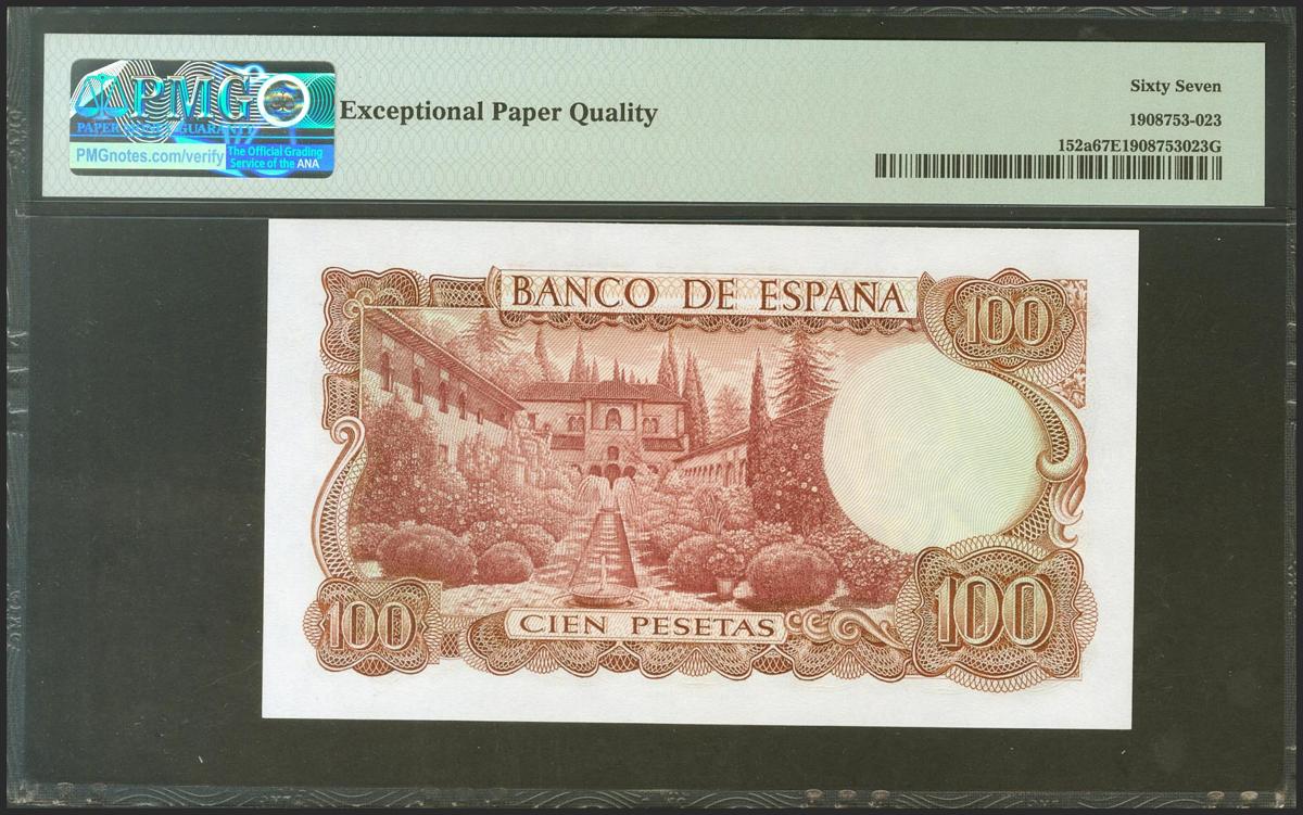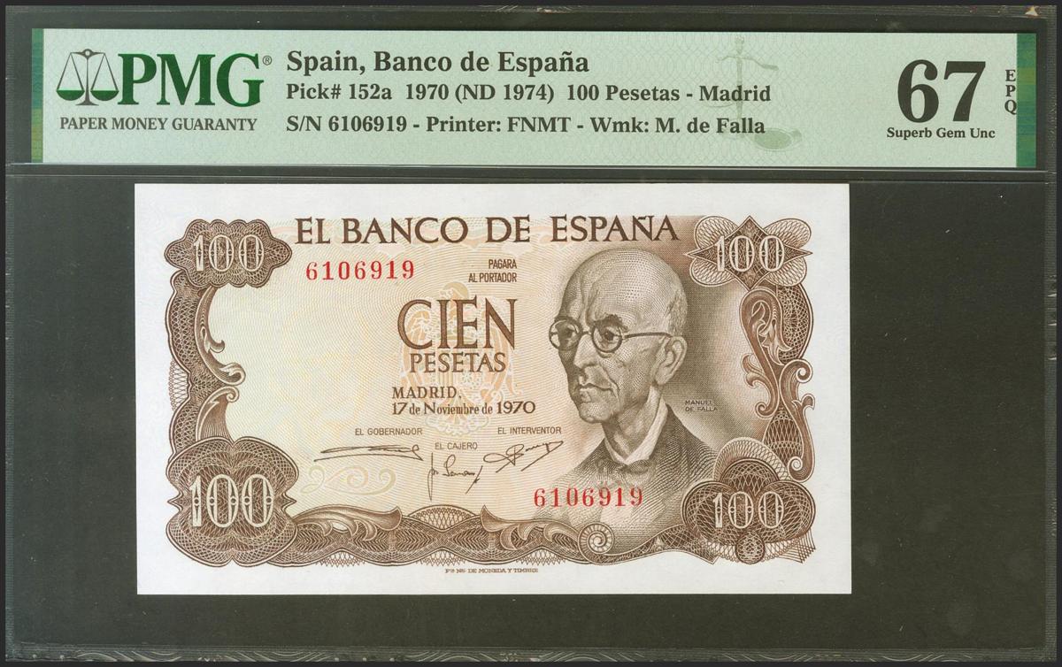 100 pesetas. November 17, 1970. Without series. (Edifil 2021: 472, Pick: 152a). Original sizing, unusual in this quality. Uncirculated. Package PMG67EPQ.