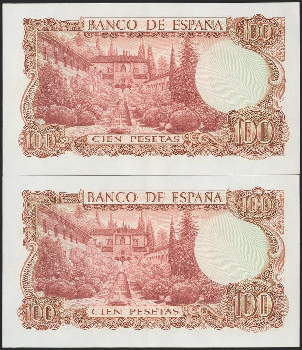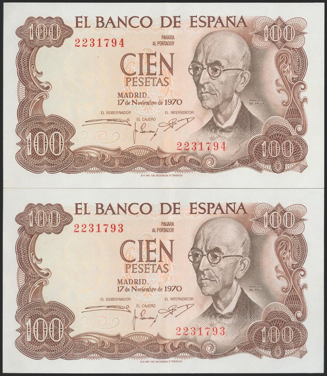 100 pesetas. November 17, 1970. Correlative pair. No serie. (Edifil 2021: 472). It retains much of the original size. Good Extremely Fine.
