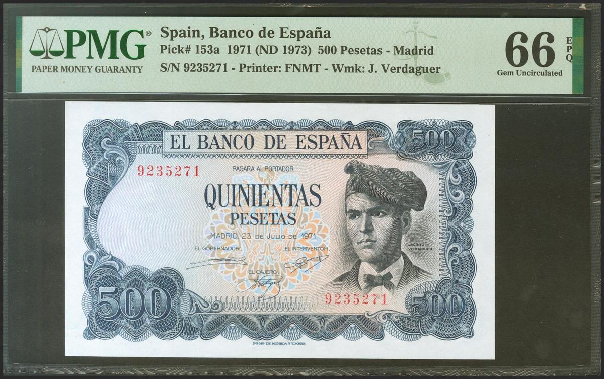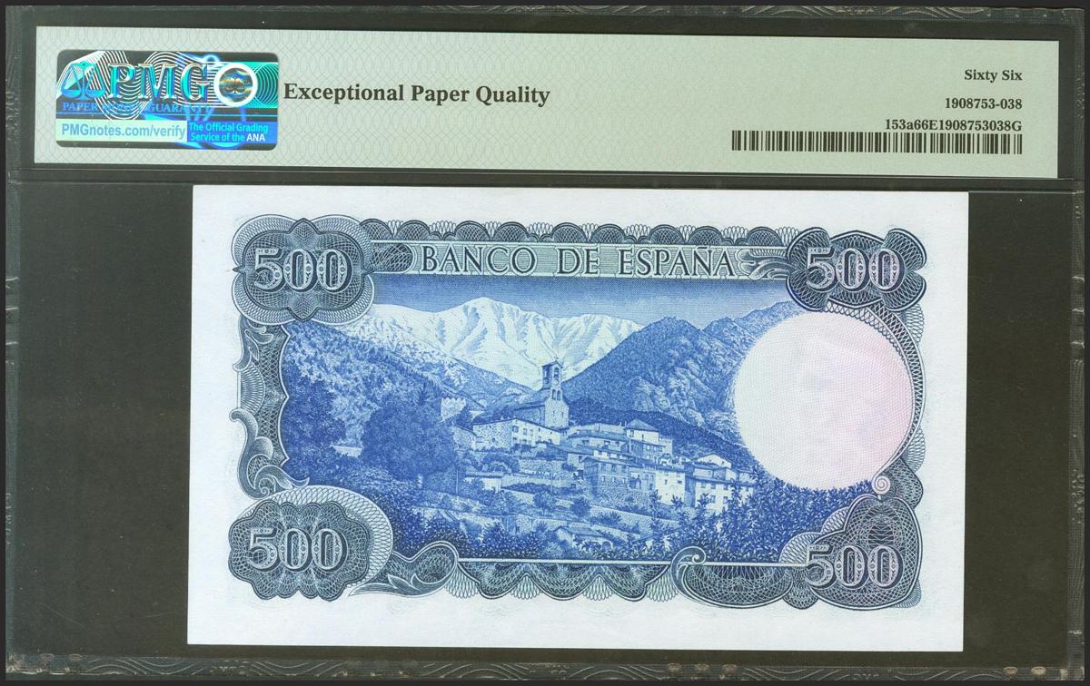 500 pesetas. July 23, 1971. Without series. (Edifil 2021: 473, Pick: 153). Very rare in this exceptional quality, original sizing. Uncirculated. Package PMG66EPQ.
