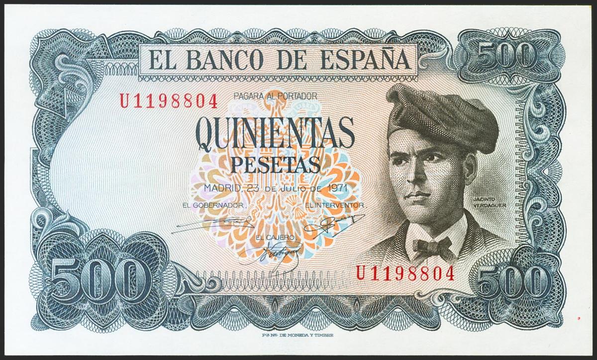 500 pesetas. July 23, 1971. Series U. (Edifil 2021: 473a). Original sizing. Uncirculated.