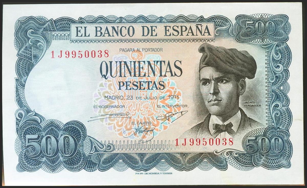 500 pesetas. July 23, 1971. Series 1J. (Edifil 2021: 473a). Original sizing. Almost Uncirculated.