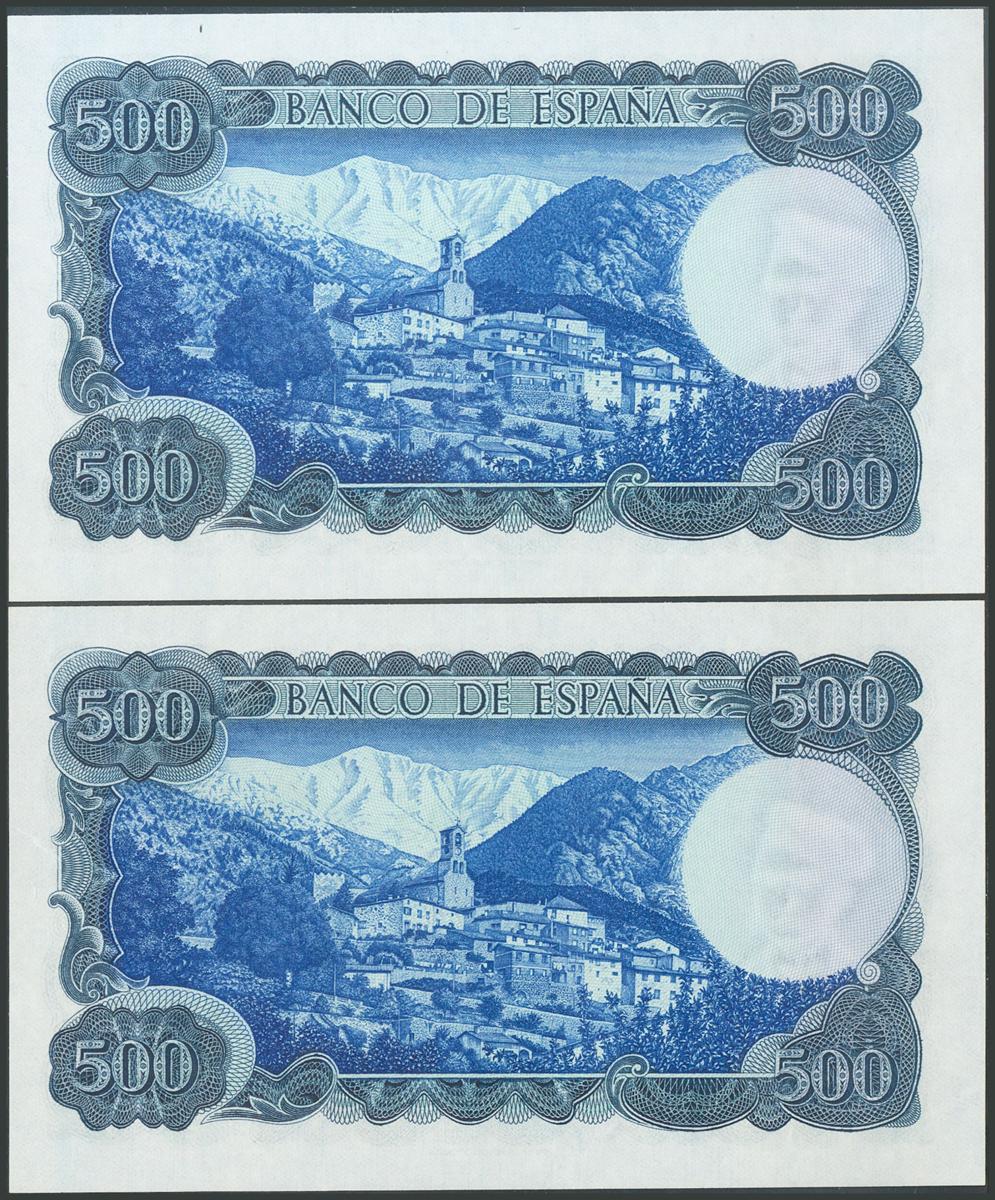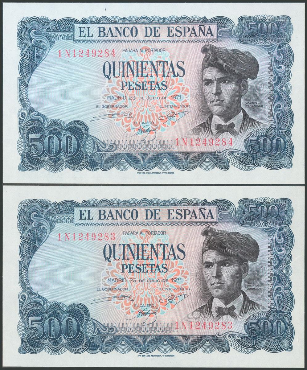 500 pesetas. July 23, 1971. Correlative couple. Series 1N. (Edifil 2017: 473a). Original sizing. Uncirculated/ Almost Uncirculated.