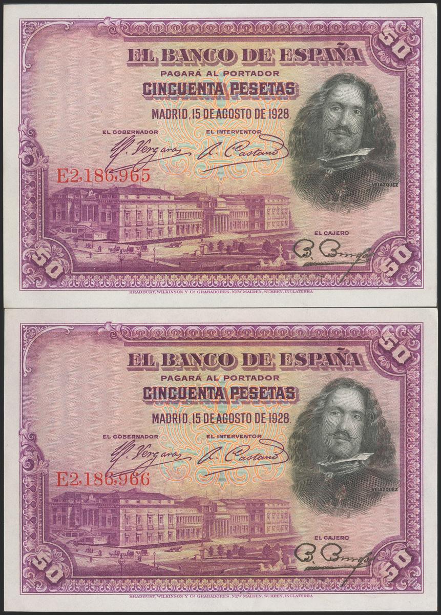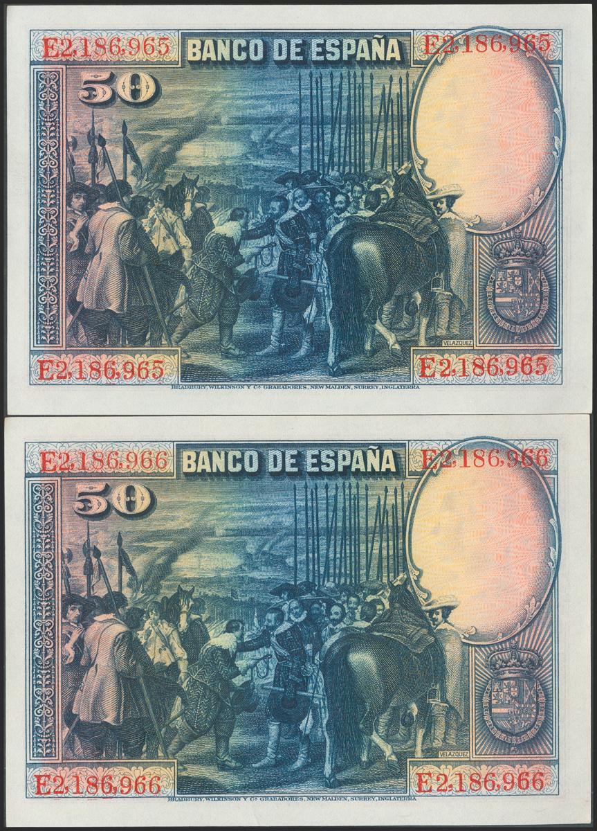 50 pesetas. August 15, 1928. Correlative couple. Series E. (Edifil 2017: 354). Original sizing. Uncirculated.