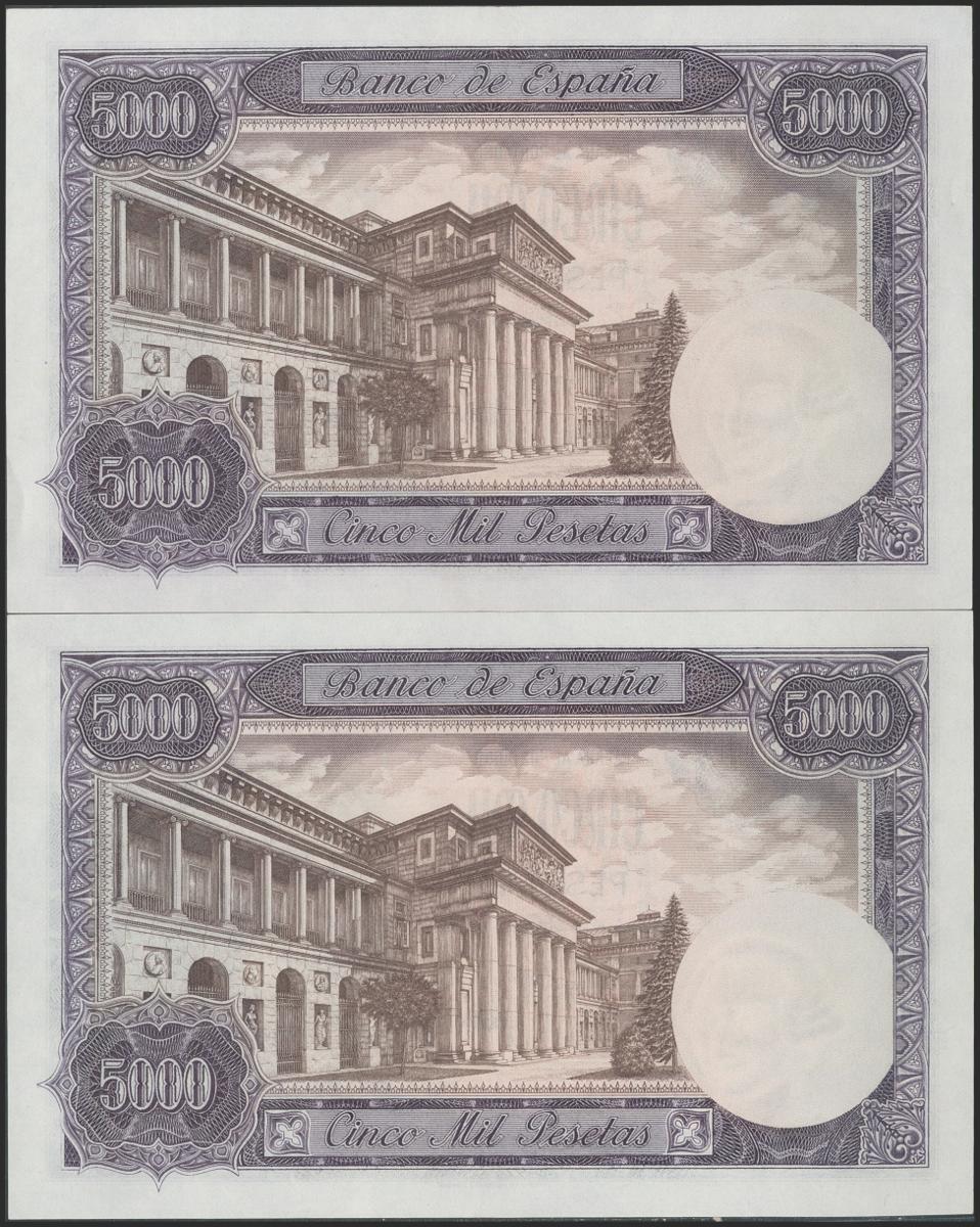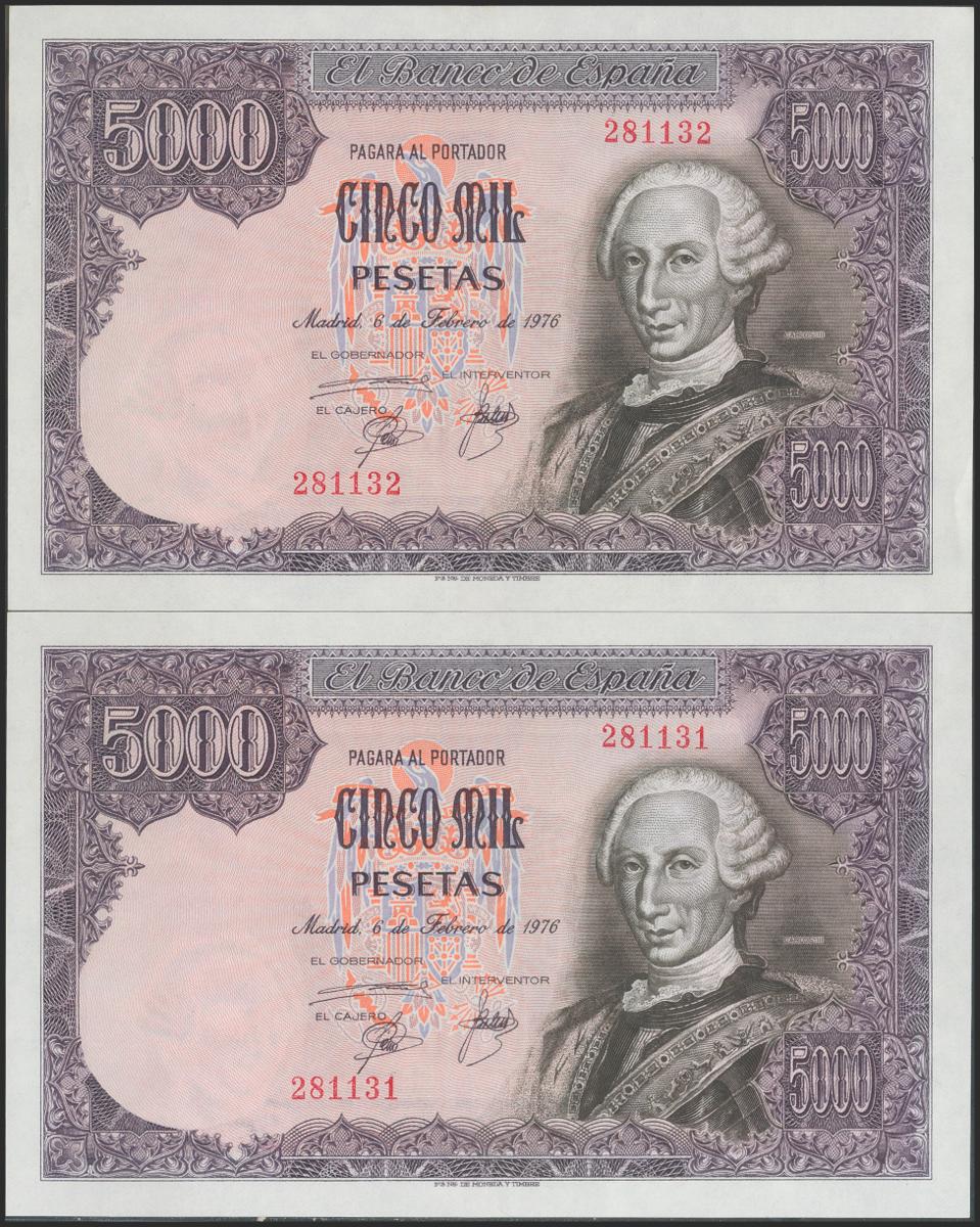 5000 pesetas. February 6, 1976. Correlative pair. No serie. (Edifil 2021: 475a). Uncirculated/ Almost Uncirculated.