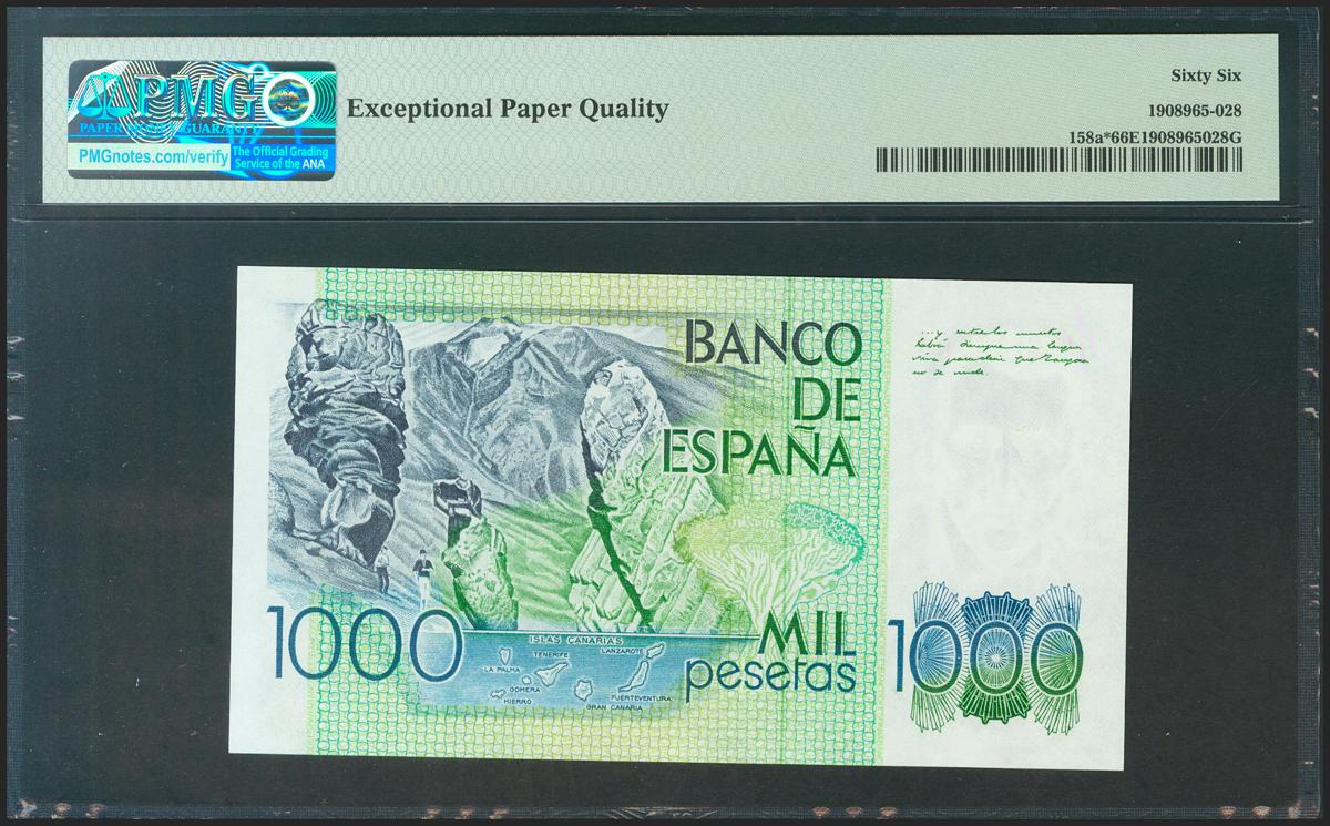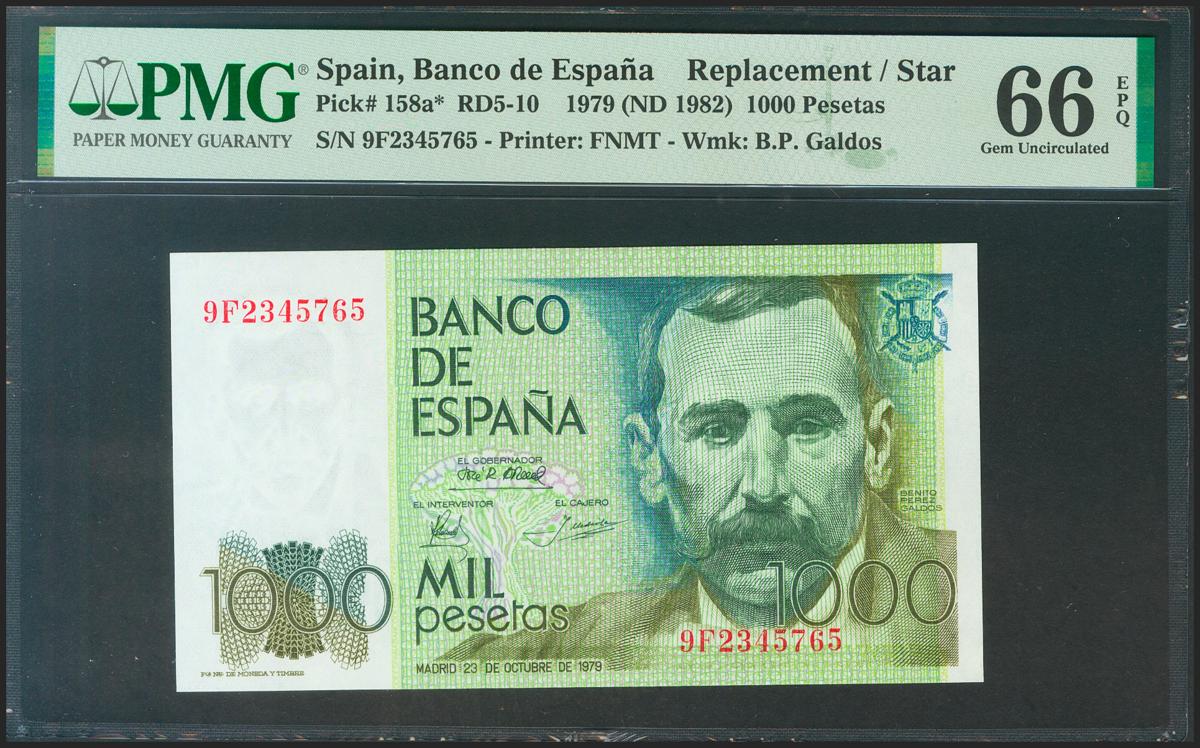 1000 Pesetas. October 23, 1979. Special series 9F. (Edifil 2021: 477b, Pick: 158a *). Very rare in this exceptional quality, original sizing. Uncirculated. Package PMG66EPQ.