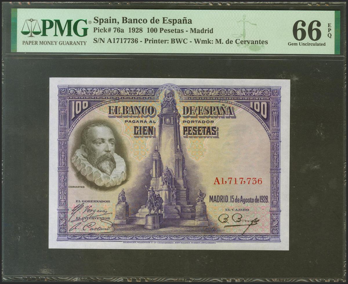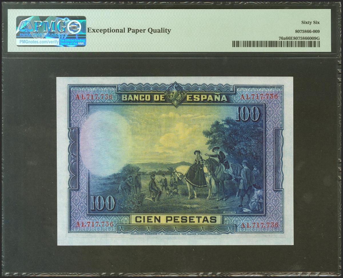 100 pesetas. August 15, 1928. Series A. (Edifil 2021: 355a, Pick: 76a). Original sizing. Uncirculated. Package PMG66EPQ.