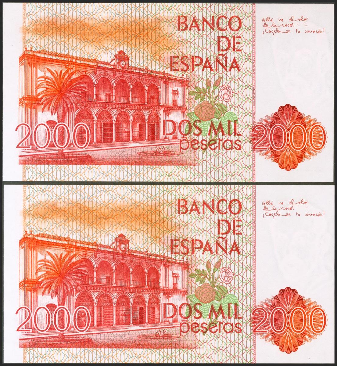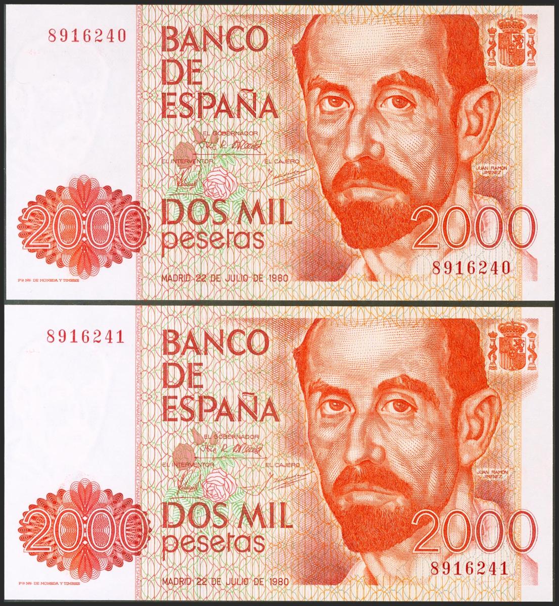 2000 pesetas. July 22, 1980. Correlative couple. No serie. (Edifil 2021: 479). Almost Uncirculated.