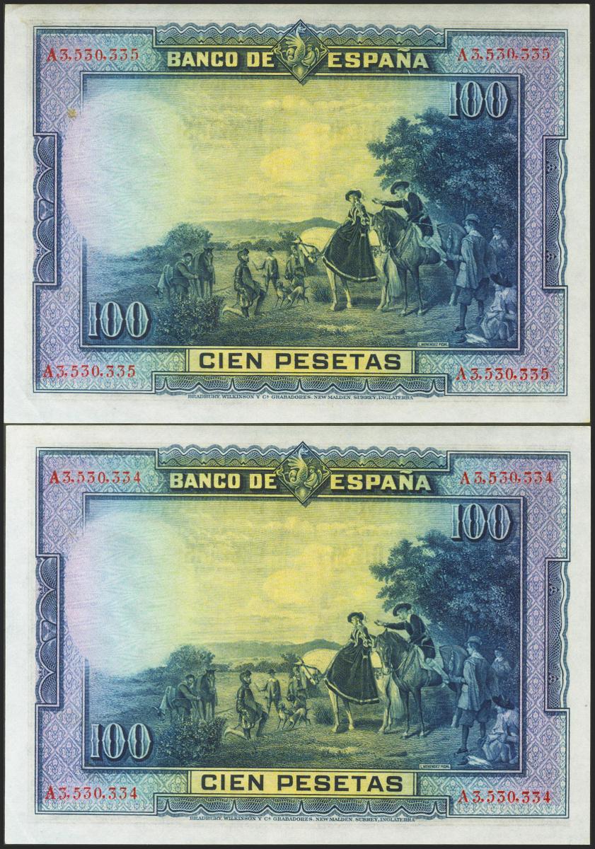 100 pesetas. August 15, 1928. Correlative couple. Series A. (Edifil 2021: 355a). It retains much of the original size. Almost Uncirculated.
