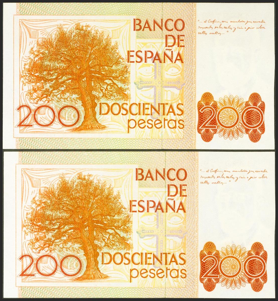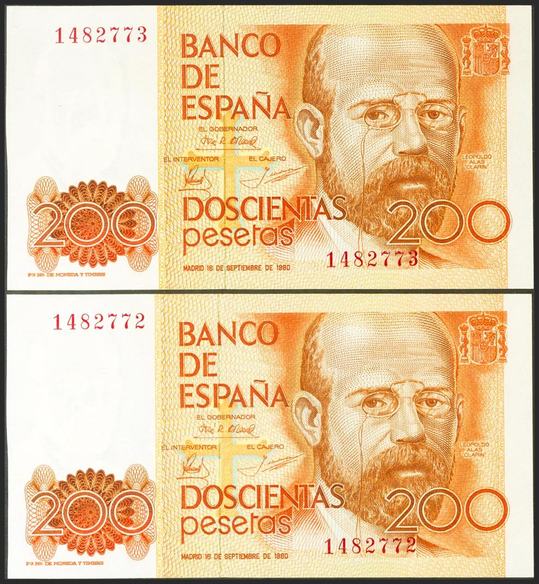 English 200 pesetas. September 18, 1980. Correlative pair. No serie. (Edifil 2017: 480). Good Extremely Fine.