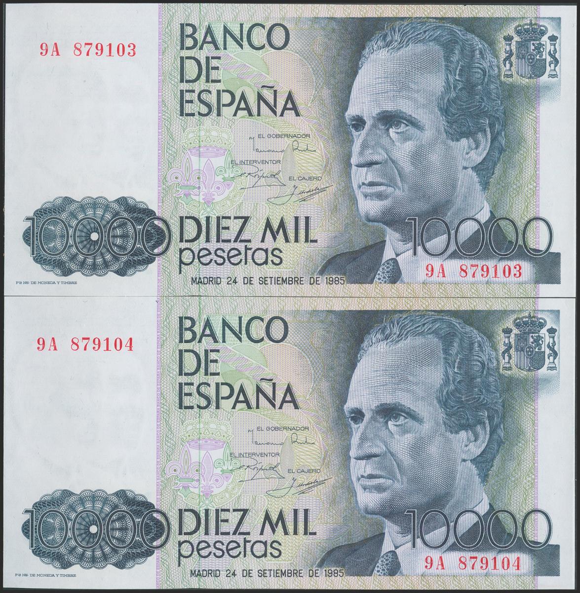 10000 Pesetas. September 24, 1985. Correlative pair. Series 9A, special numbering. (Edifil 2017: 481b). Good Extremely Fine.
