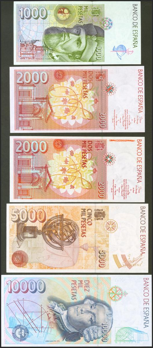 Series of banknotes of 1000, 2000 (also another with the numbering 1S), 5000 and 10000 Pesetas issued in 1992 and all of them with the same serial number Nº004518. (Edifil 2021: 482/85, 482A). Rare set. Uncirculated.