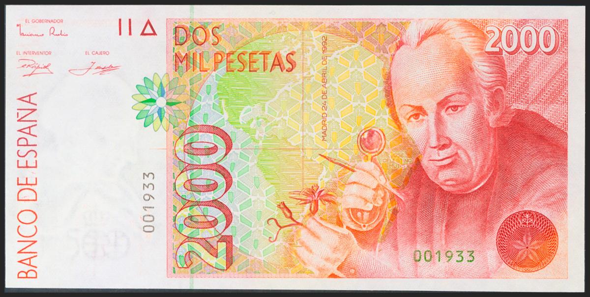 2000 pesetas. April 24, 1992. No series and very low numbering. (Edifil 2021: 482). Uncirculated.