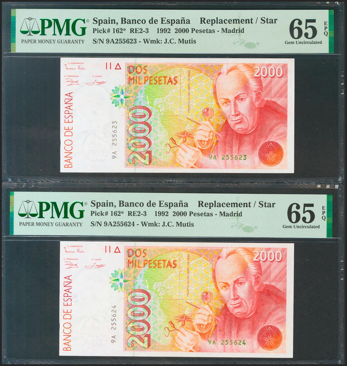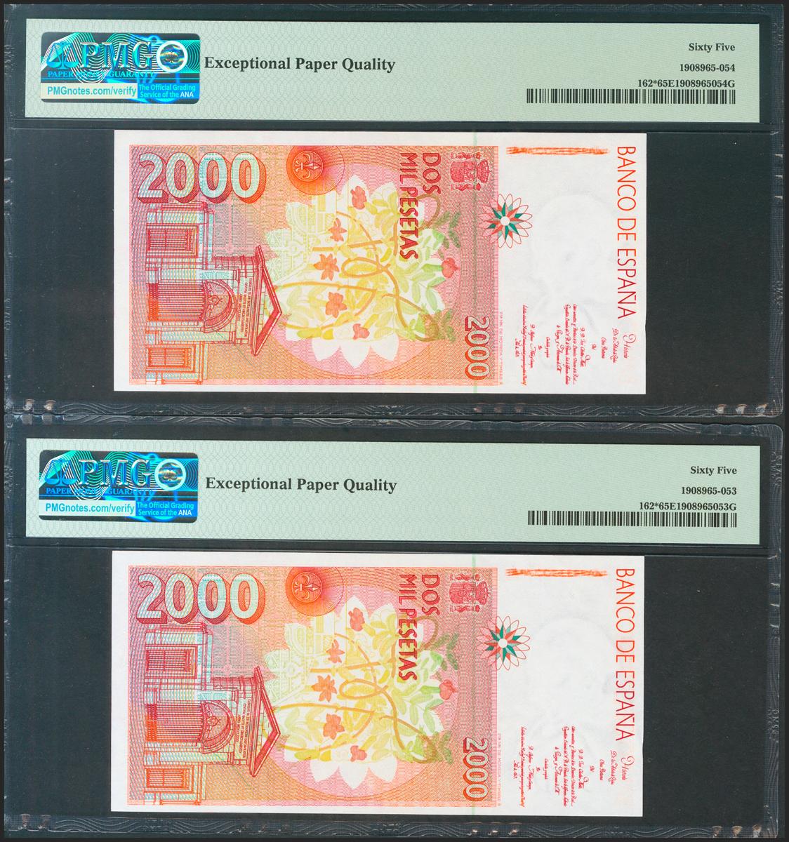 English 2000 pesetas. April 24, 1992. Correlative couple. 9A special series. (Edifil 2021: 482b, Pick: 162 *). Rare in this quality, original sizing. Uncirculated. PMG65EPQ package, both.