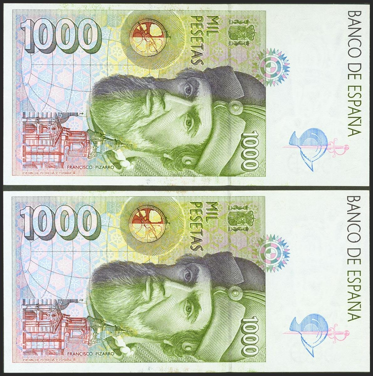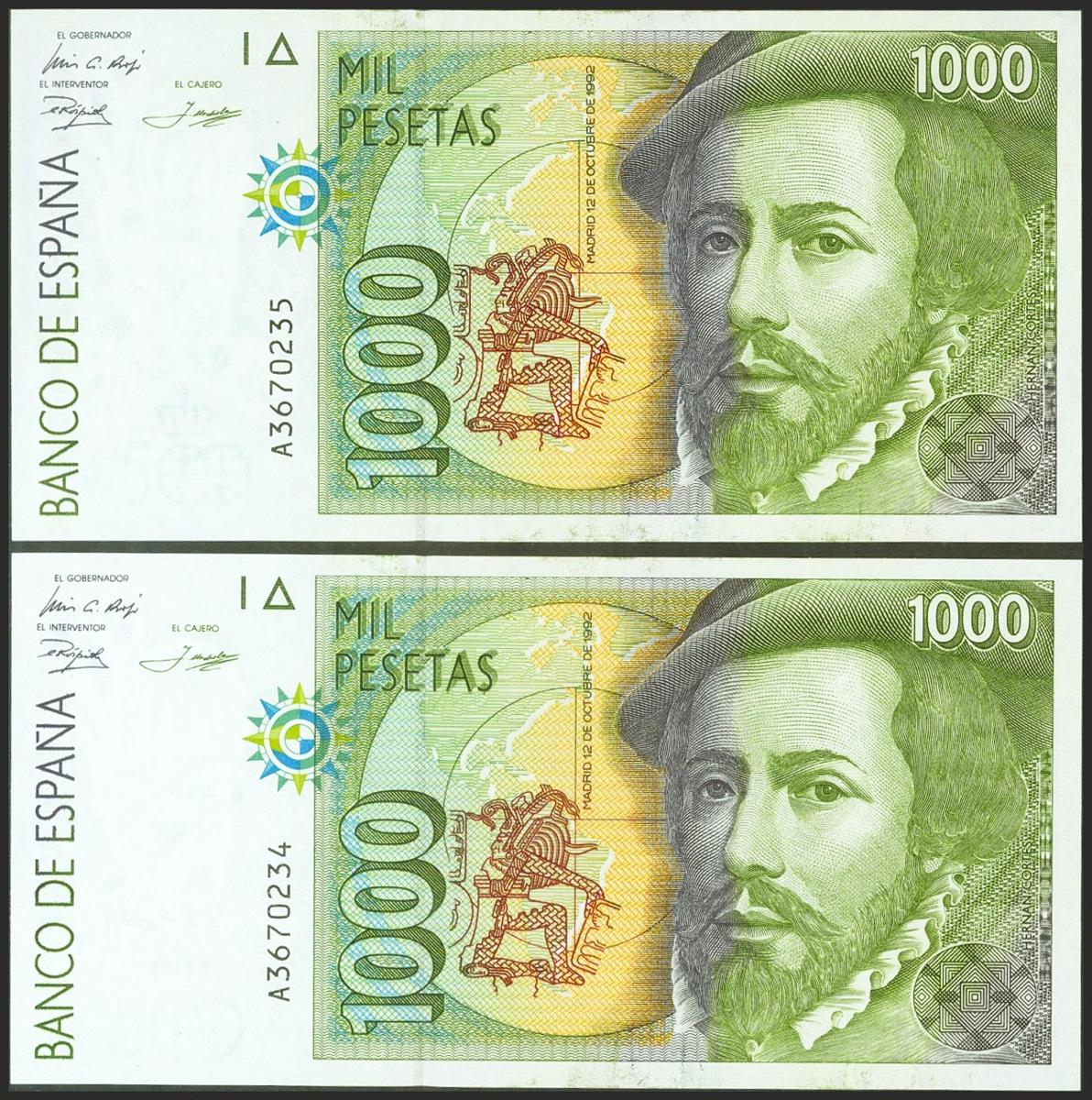 1000 Pesetas. October 12, 1992. Correlative couple. Series A. (Edifil 2021: 483a). Uncirculated.