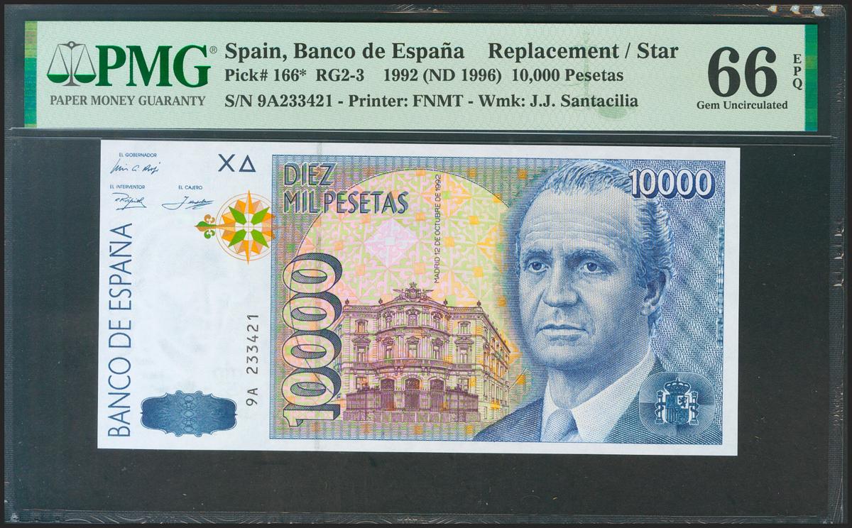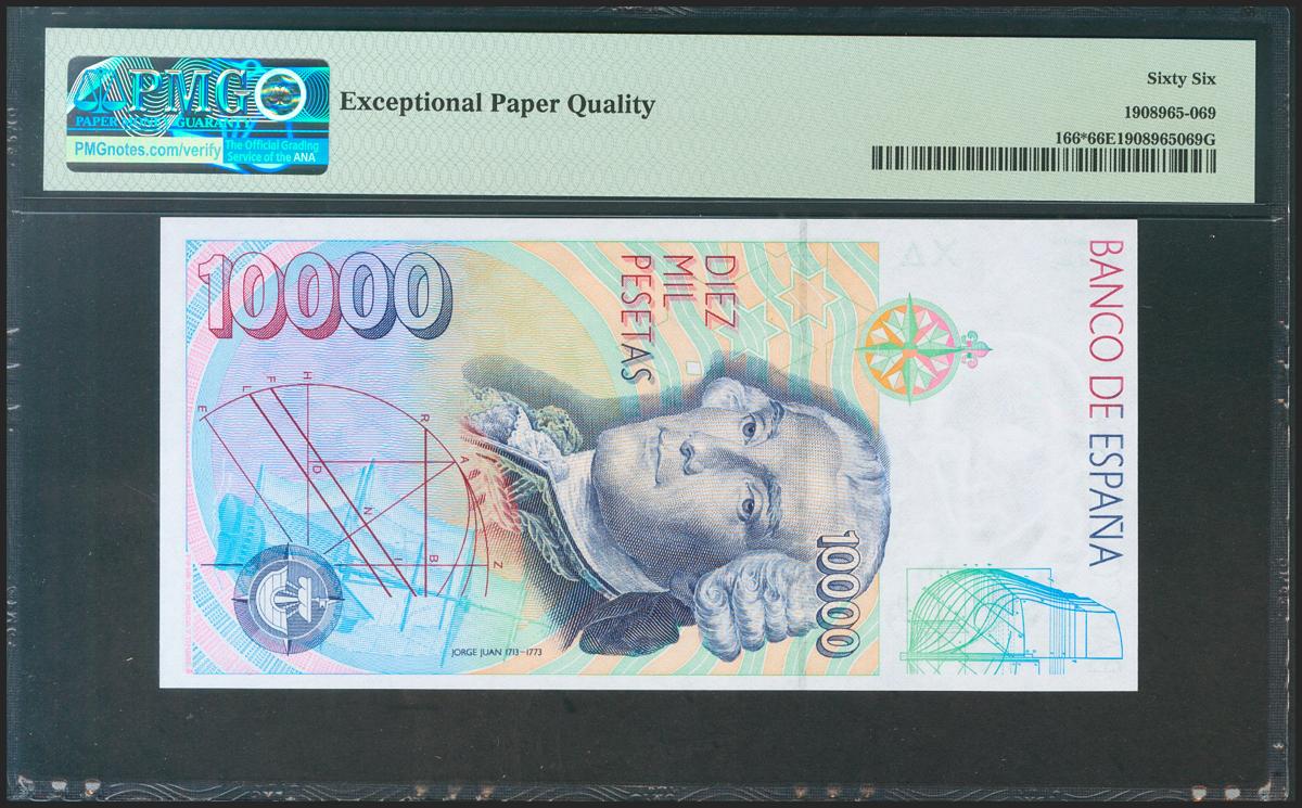 10000 Pesetas. October 12, 1992. Special Series 9A. (Edifil 2021: 485b, Pick: 166 *). Very rare in this exceptional quality, original sizing. Uncirculated. Package PMG66EPQ.