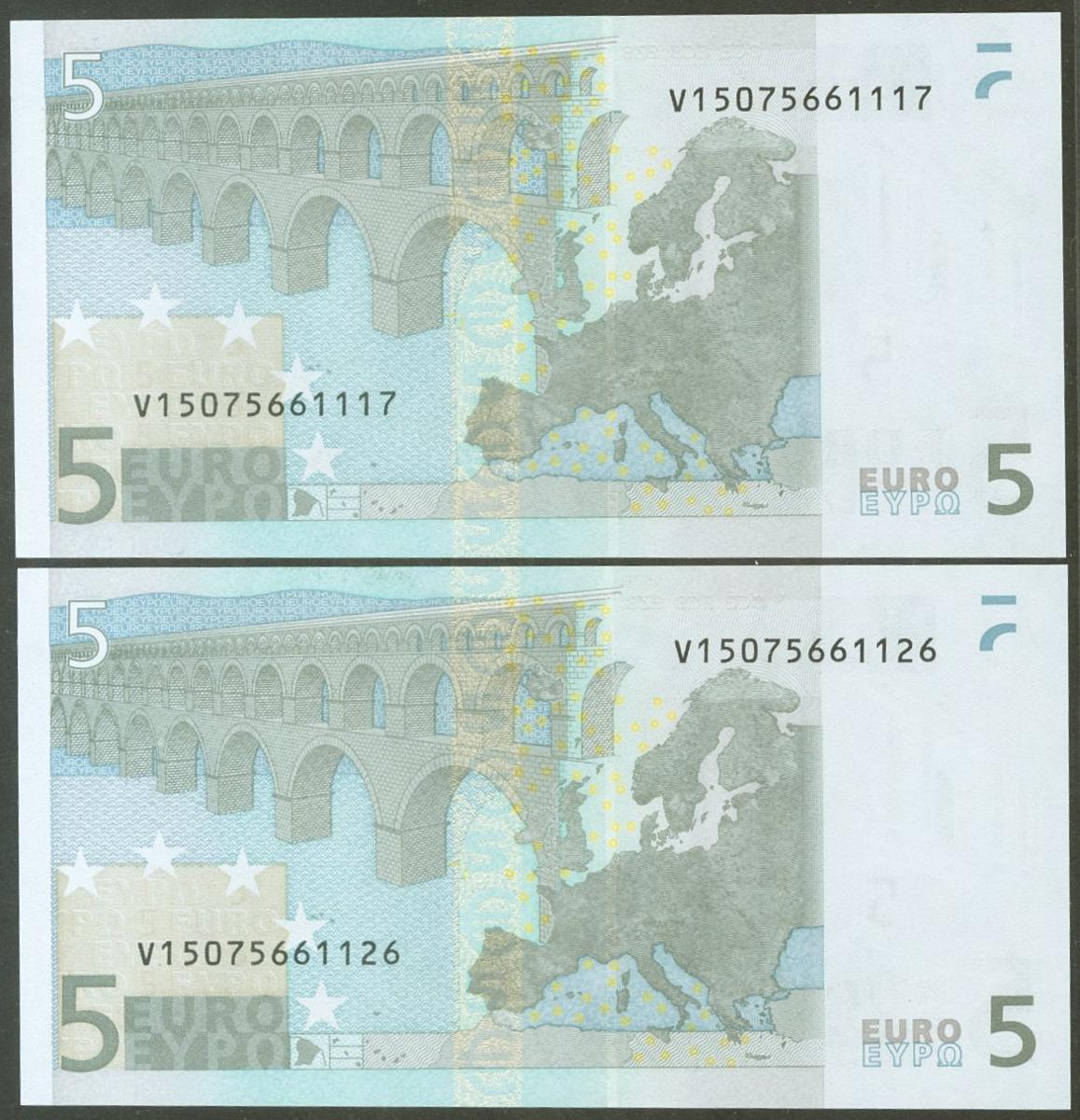 5 euros. January 1, 2002. Correlative pair (it should be remembered that the last digit of the numbering of all banknotes denominated in euros is for the internal control of the European Central Bank, the one that marks the correlation of the banknotes is the penultimate digit). Trichet signature. Series V (Spain). (Edifil 2021: 486A). Uncirculated.