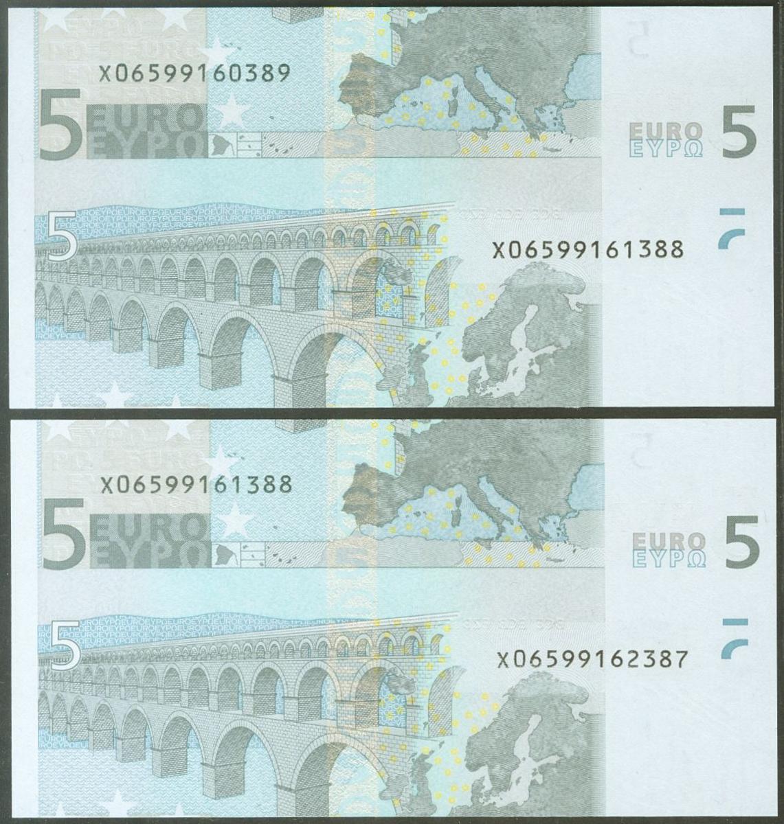 5 euros. January 1, 2002. Correlative pair cut to "look like a variety" (it should be remembered that the last digit of the numbering of all banknotes denominated in euros is for the internal control of the European Central Bank, the one that marks the correlation of the banknotes is the penultimate digit). Duisenberg signature. Series X (Germany). (Edifil 2021: 486). Uncirculated. TO EXAMINE.