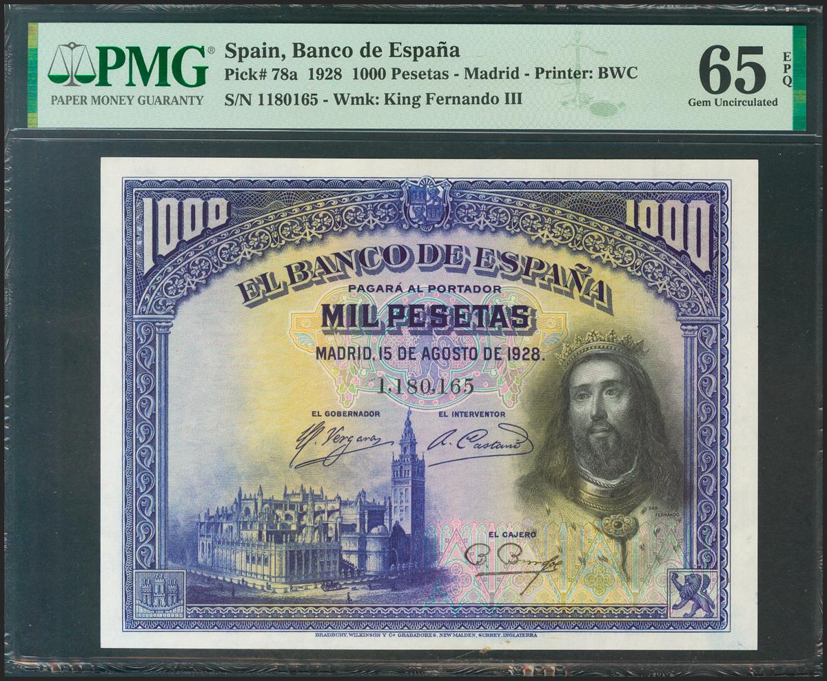 1000 Pesetas. August 15, 1928. Without series. (Edifil 2021: 357, Pick: 78a). Unusual in this quality and with original sizing. Uncirculated. PMG65EPQ package.