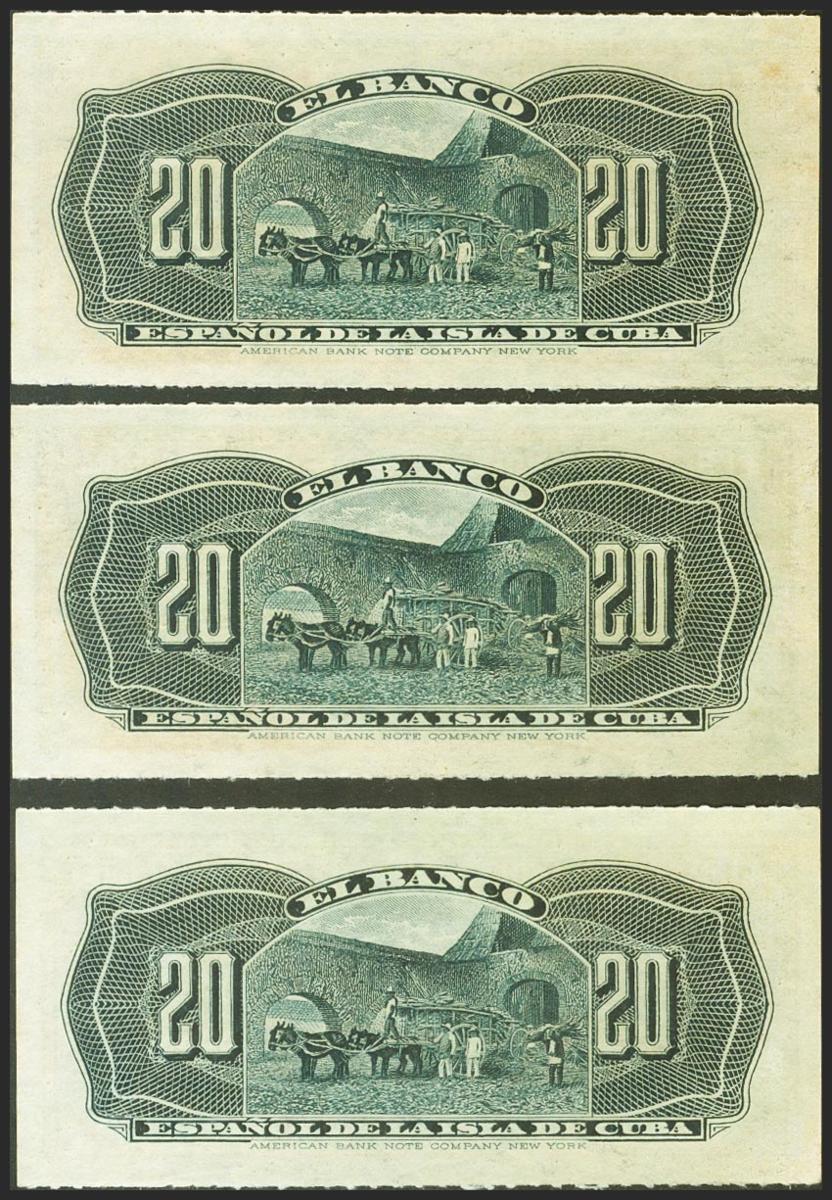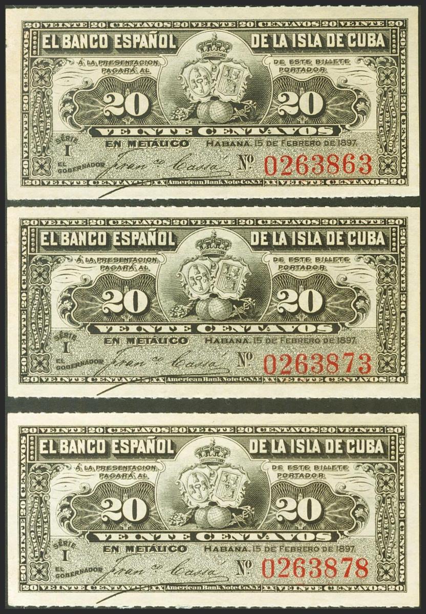 Set of 3 20 Centavos banknotes, issued on February 13, 1897, all with series I. (Edifil 2021: 85). Original sizing. Uncirculated.