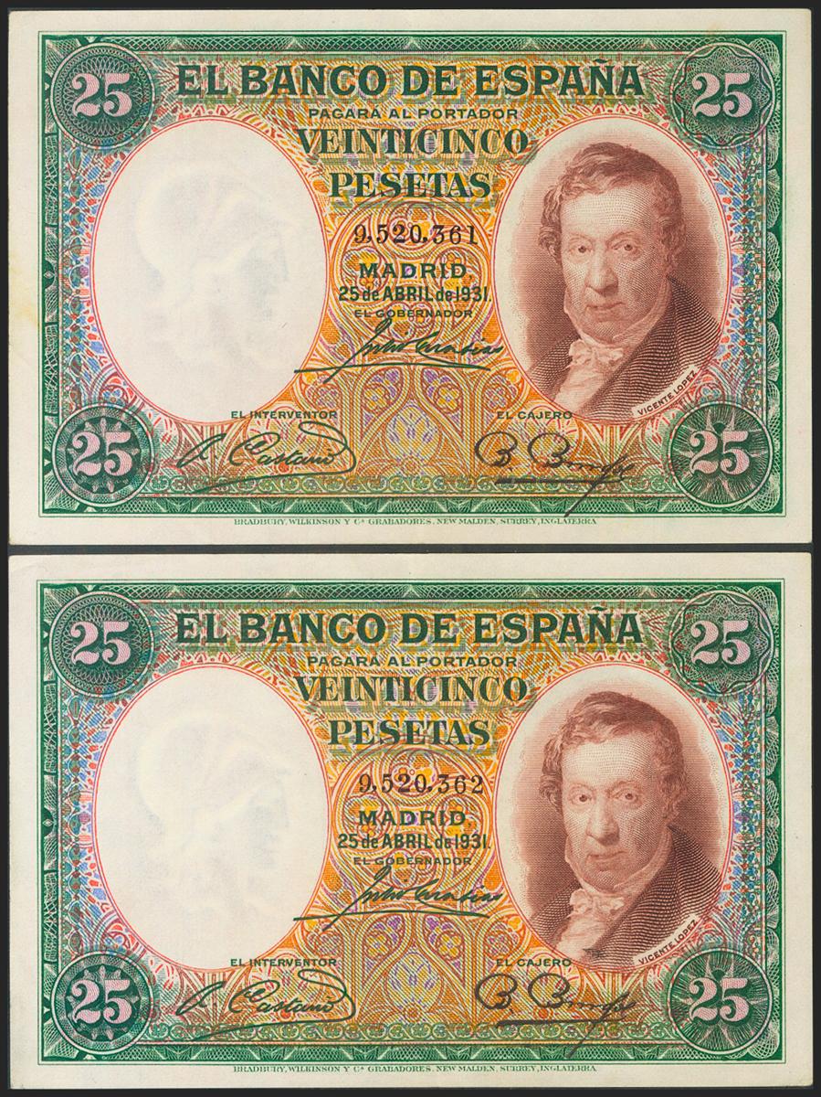 25 pesetas. April 25, 1931. Without series. (Edifil 2021: 358). Retains part of its original size, extremely attractive couple. Extremely Fine.
