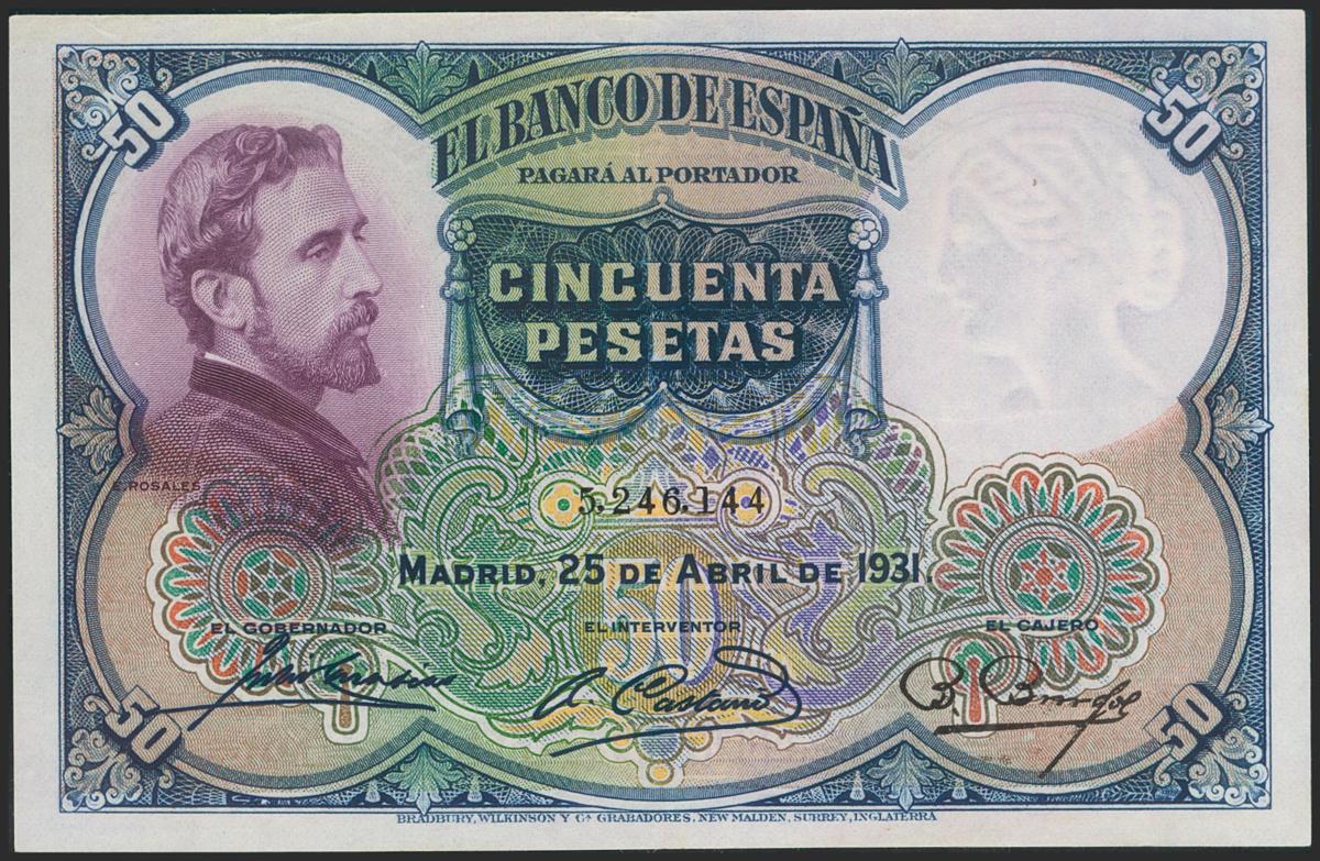 50 pesetas. April 25, 1931. (Edifil 2021: 359). It retains much of the original size. Good Extremely Fine.