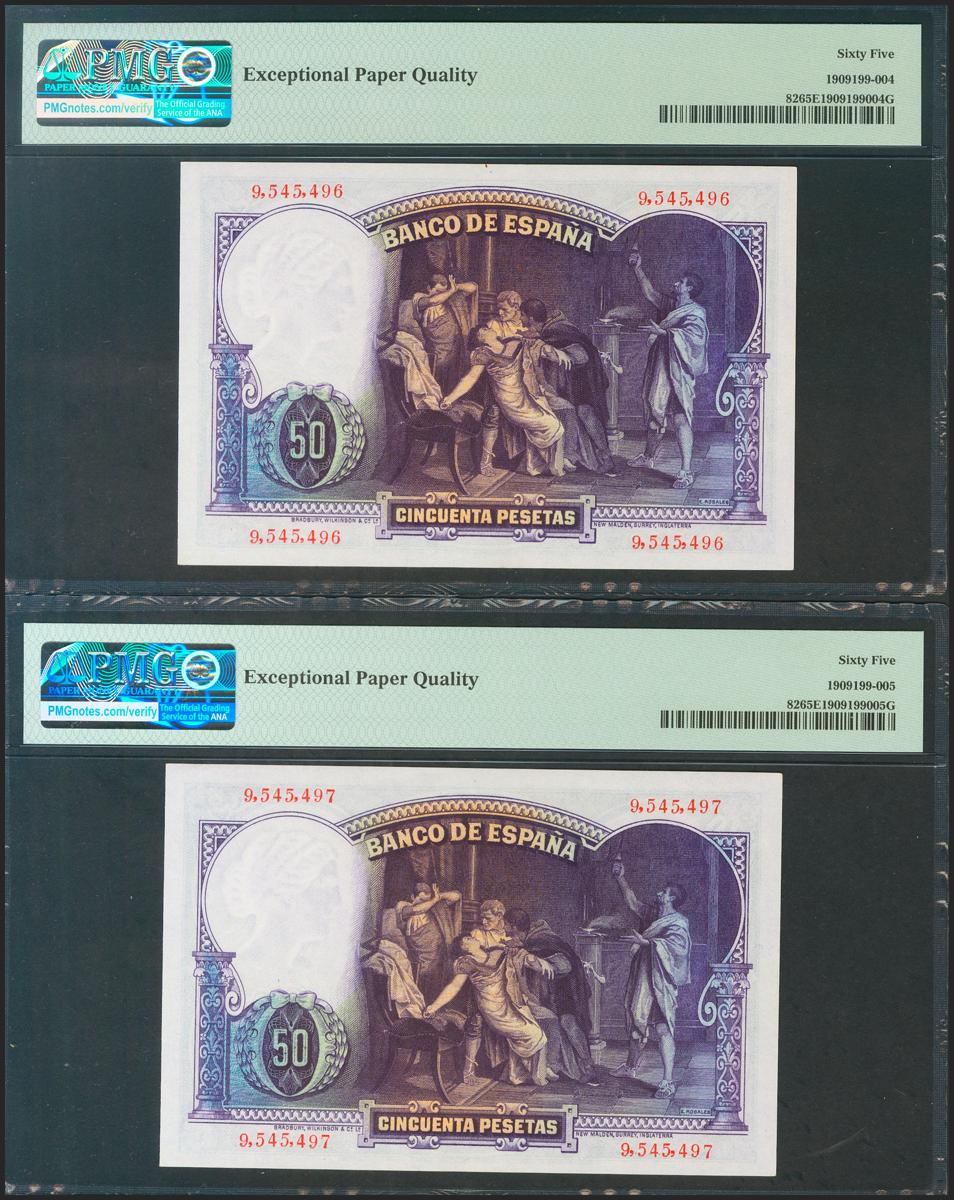 English 50 pesetas. April 25, 1931. Correlative pair. No serie. (Edifil 2021: 359, Pick: 82). Very rare, especially in this quality and with original sizing. Uncirculated. PMG65EQP package, both.