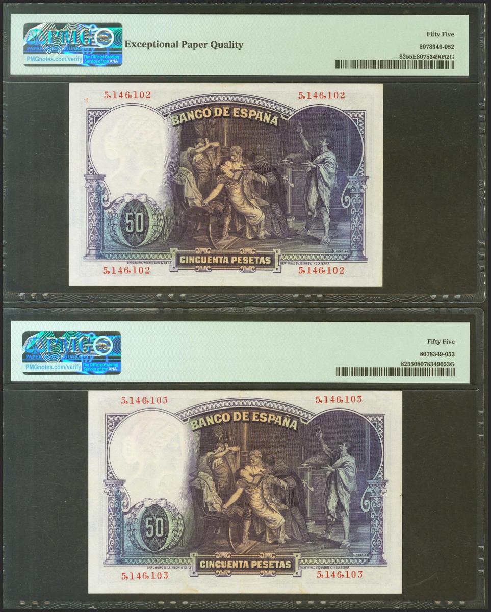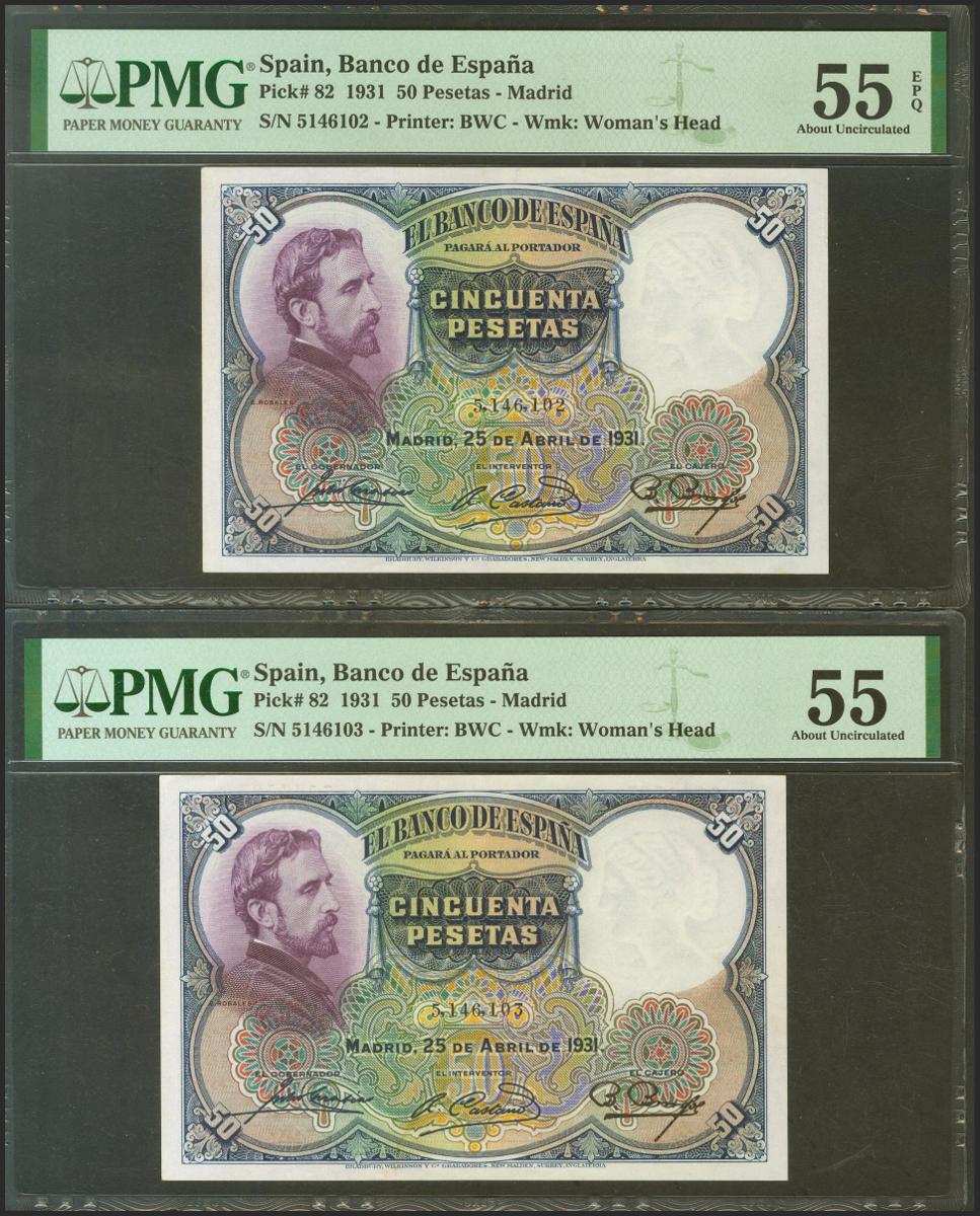 50 pesetas. April 25, 1931. Correlative pair. No serie. (Edifil 2021: 359, Pick: 82). Unusual pair, especially in this conservation. Good Extremely Fine. PMG55 / 55EPQ packages.