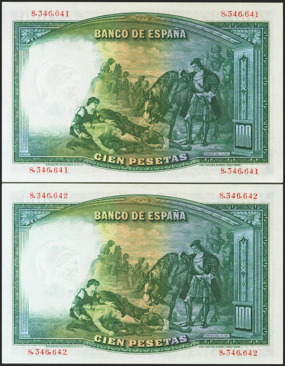 100 pesetas. April 25, 1931. Correlative pair. No serie. (Edifil 2021: 360). Original sizing. Almost Uncirculated.
