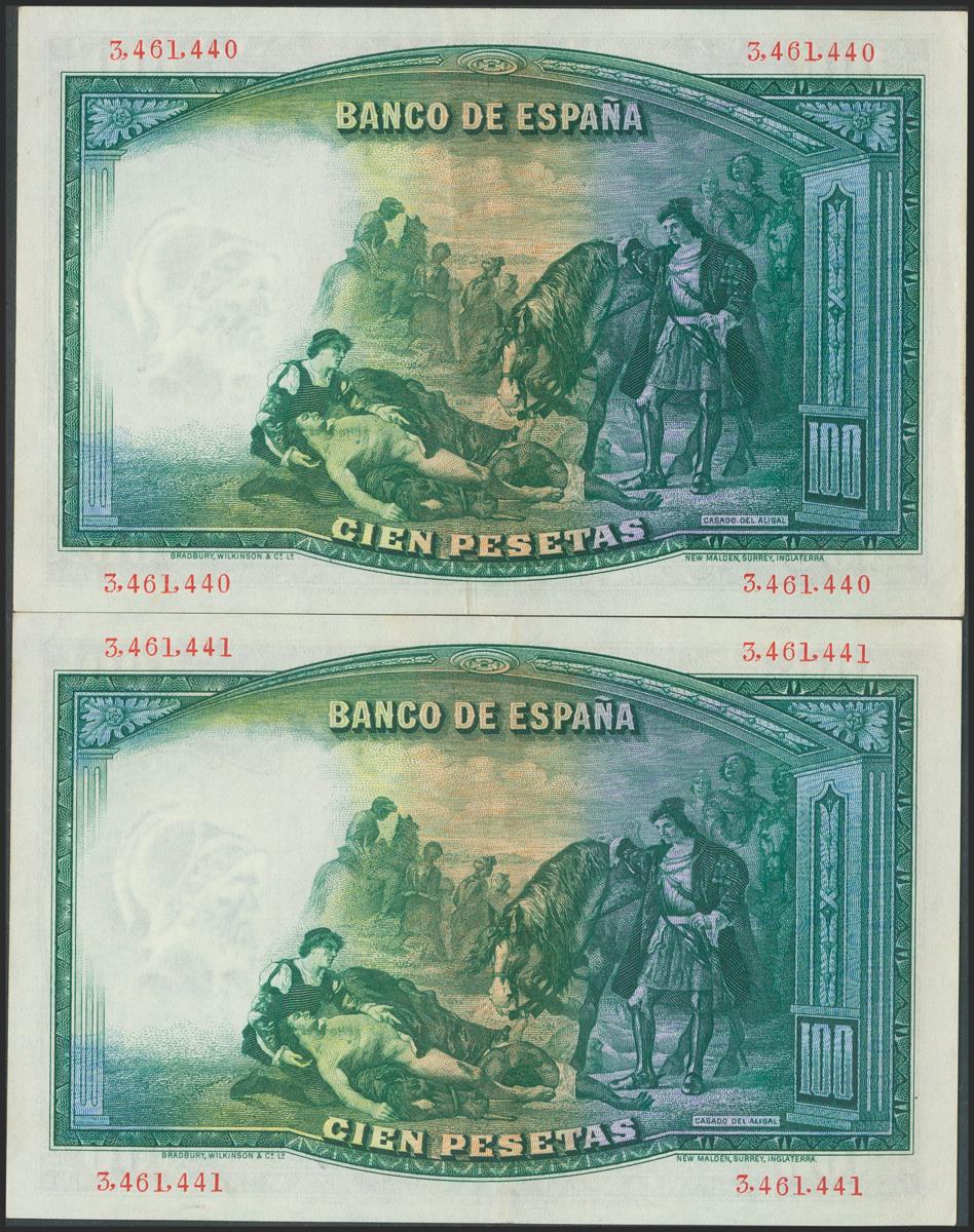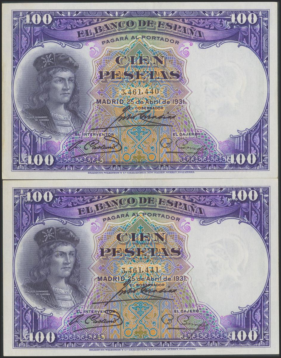 100 pesetas. April 25, 1931. Correlative pair. No serie. (Edifil 2017: 360). It retains much of the original size. Extremely Fine.