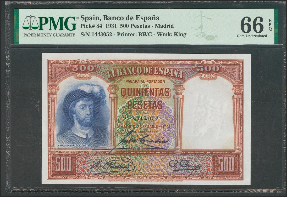 500 pesetas. April 25, 1931. Without series. (Edifil 2021: 361). Original sizing. Uncirculated. Package PMG66EPQ.