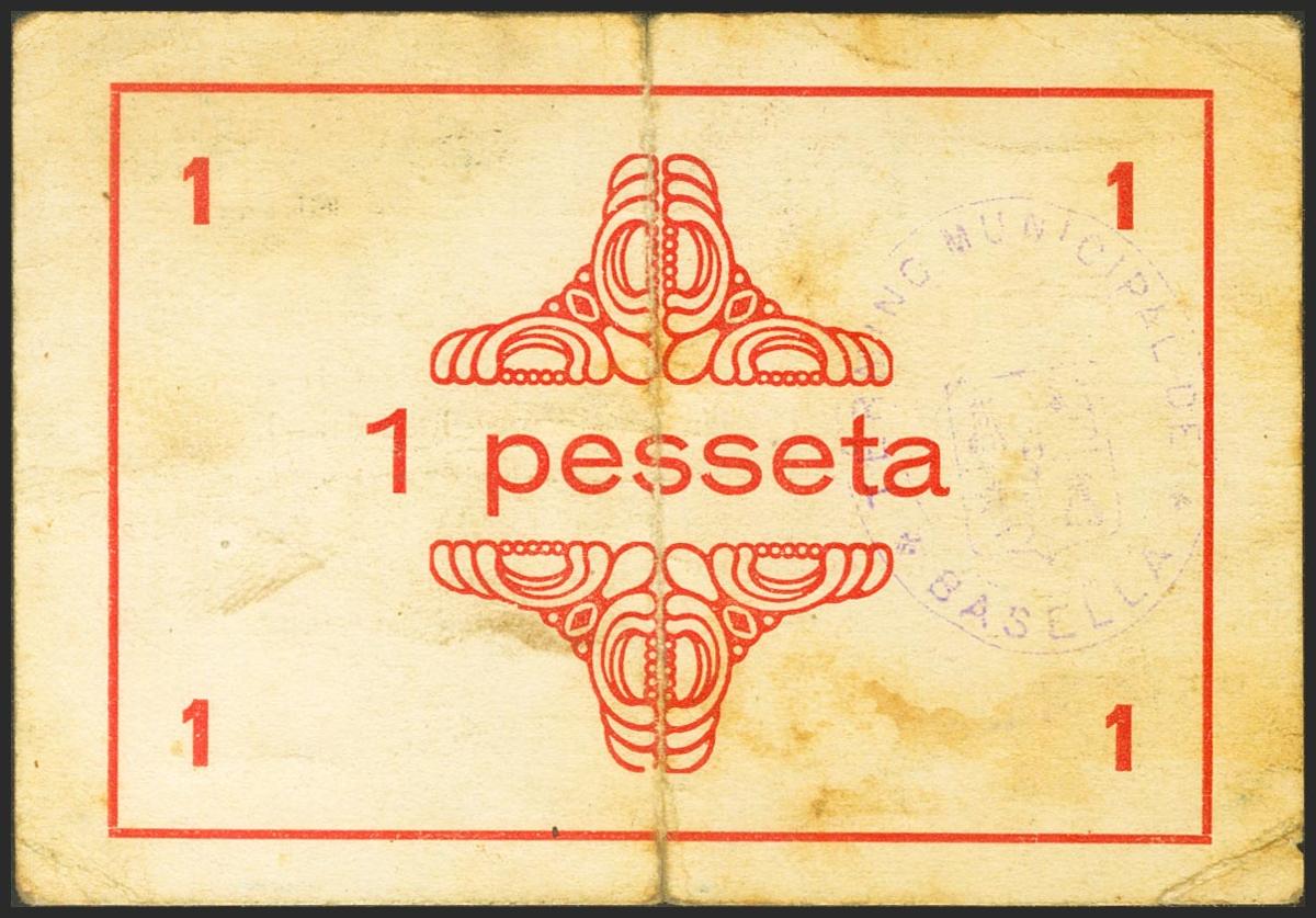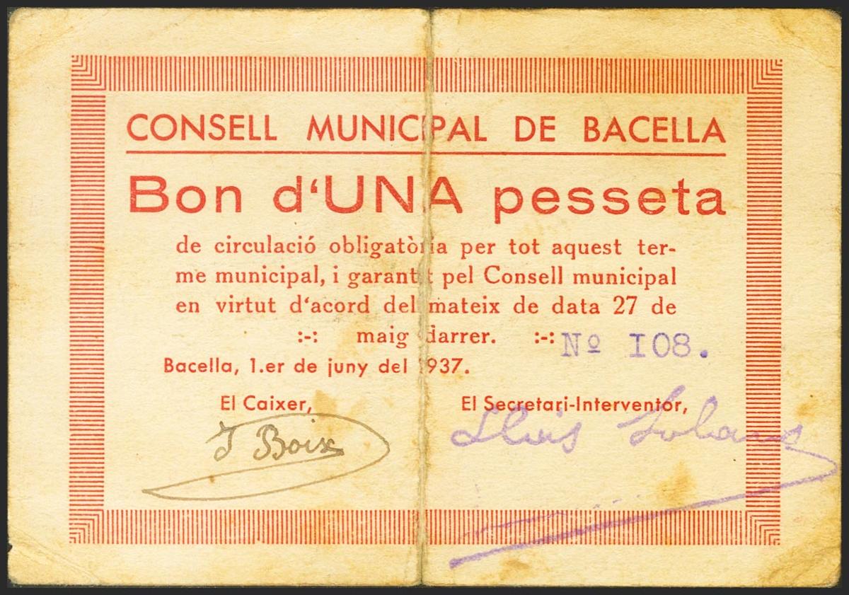 BACELLA (LERIDA). 1 Peseta. June 1, 1937. (González: 6456). Very Rare. Very Fine.