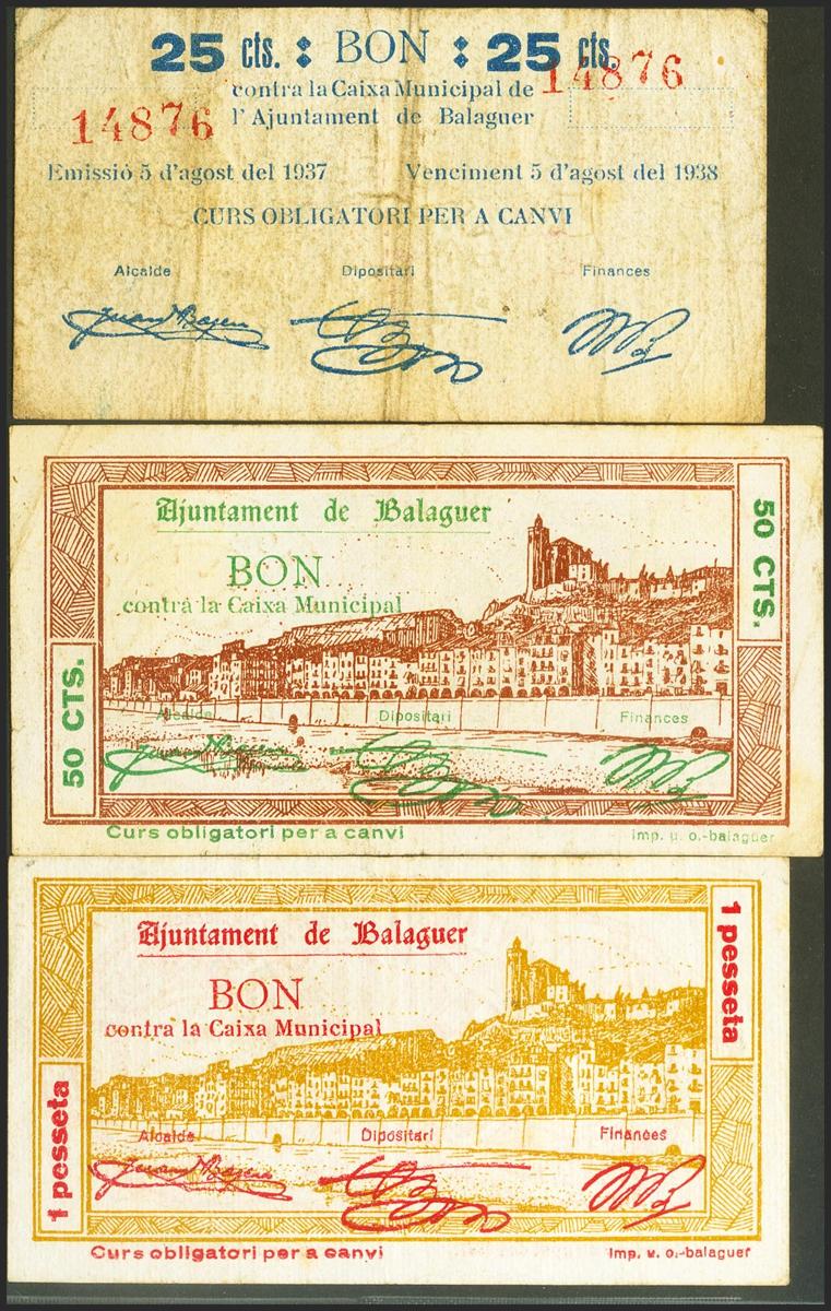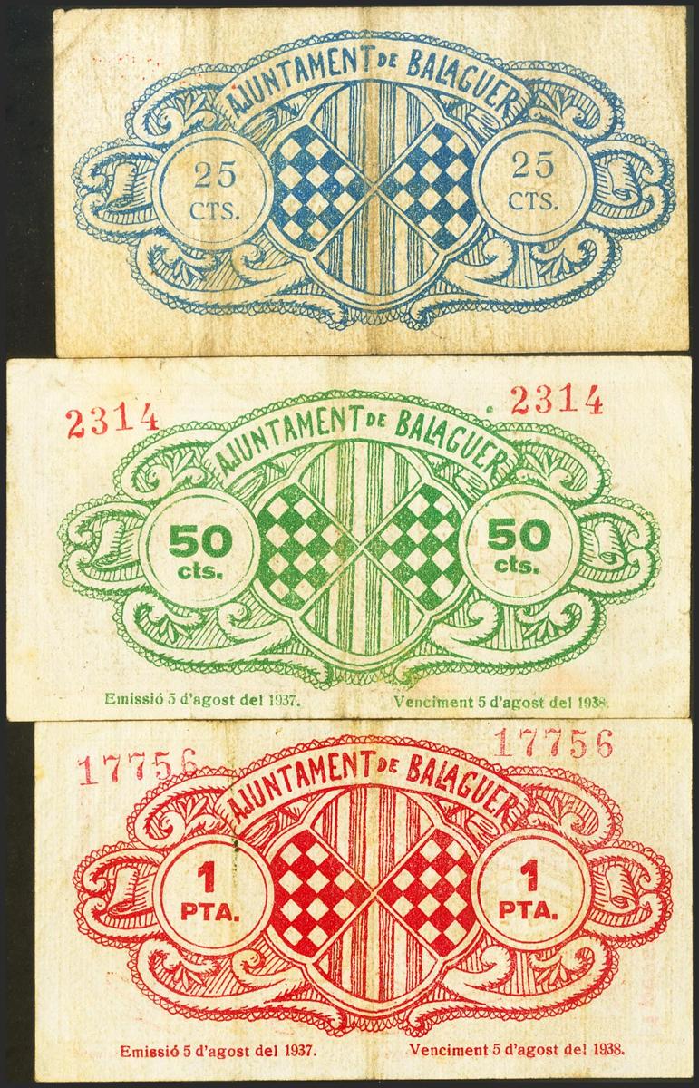 BALAGUER (LERIDA). 25 Cents, 50 Cents and 1 Peseta. August 5, 1937. (González: 6486/88). Complete series. Very Fine/ Good Very Fine.