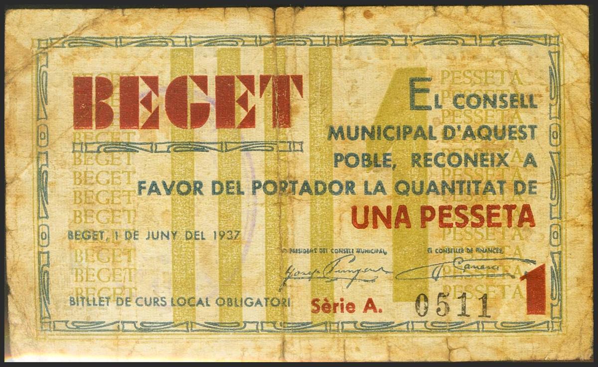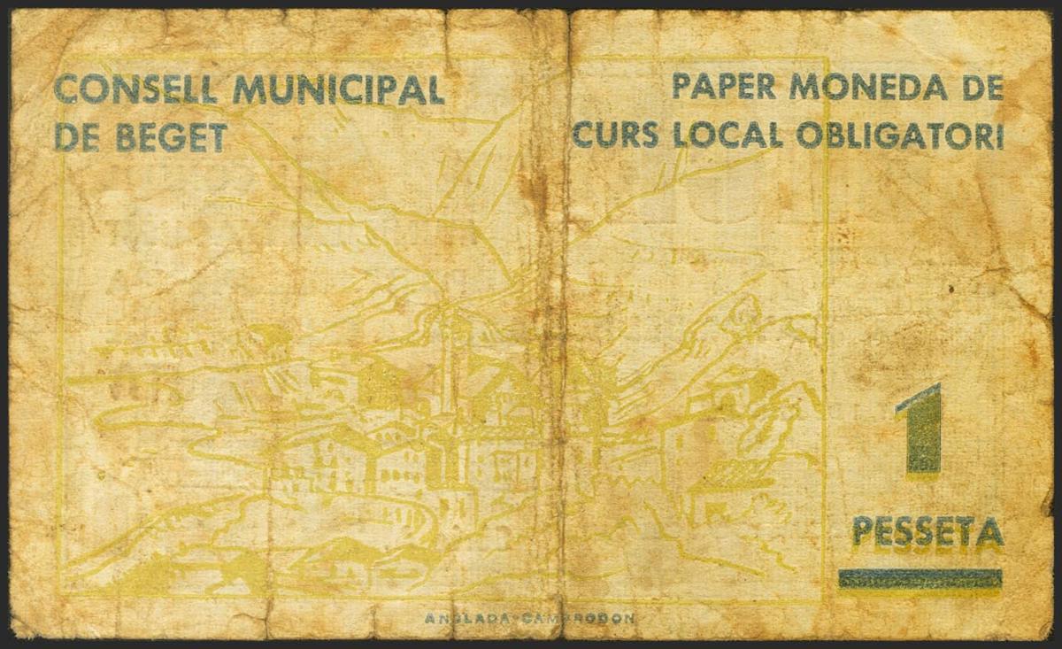 BEGUET (GERONA). 1 Peseta. June 1, 1937. Series A. (González: 6923). Very rare. Almost Very Fine.