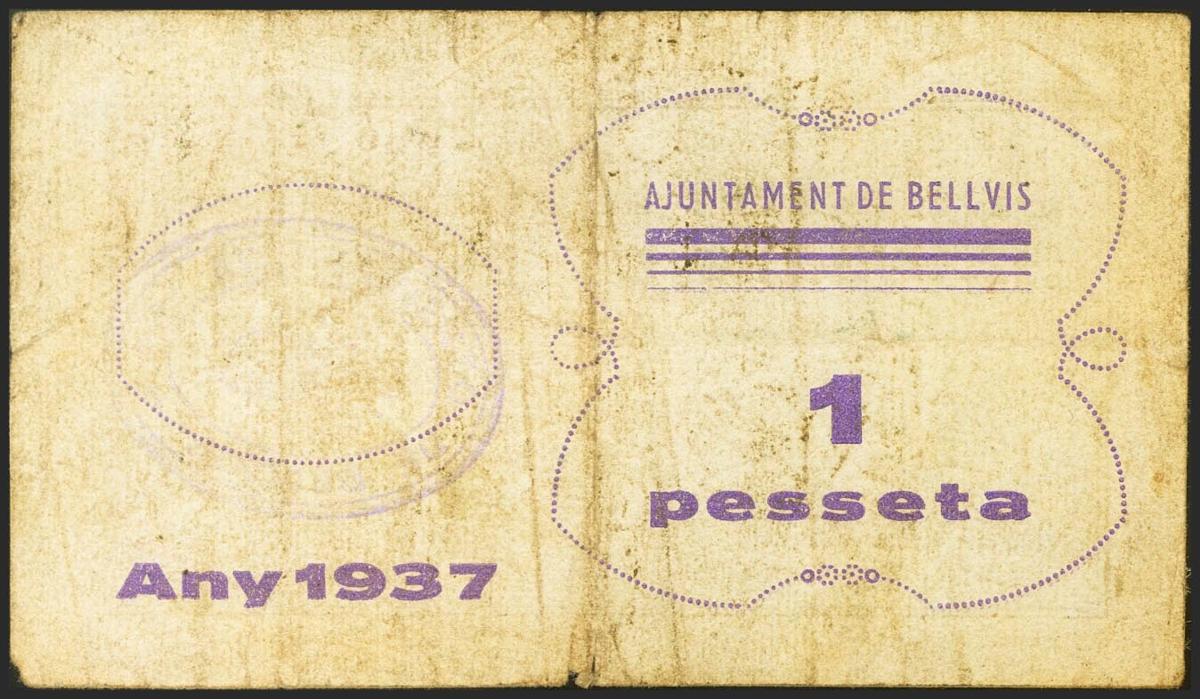 BELLVIS (LERIDA). 1 Peseta. January 3, 1937. Series A. (González: 7010). Very rare. Very Fine.